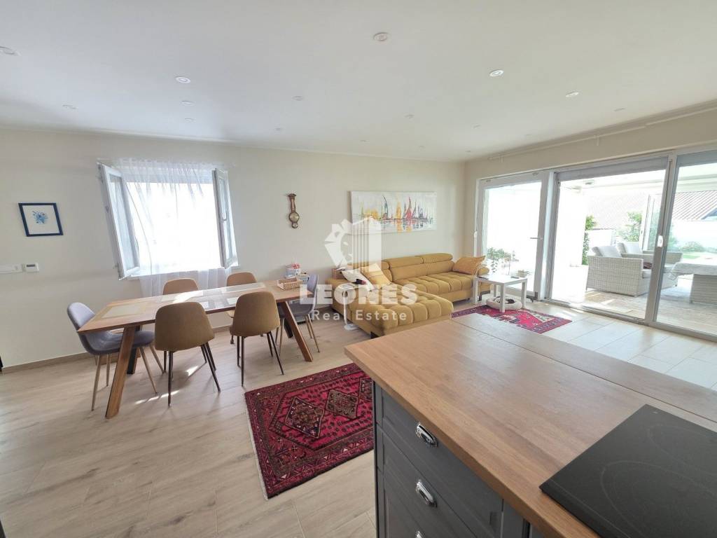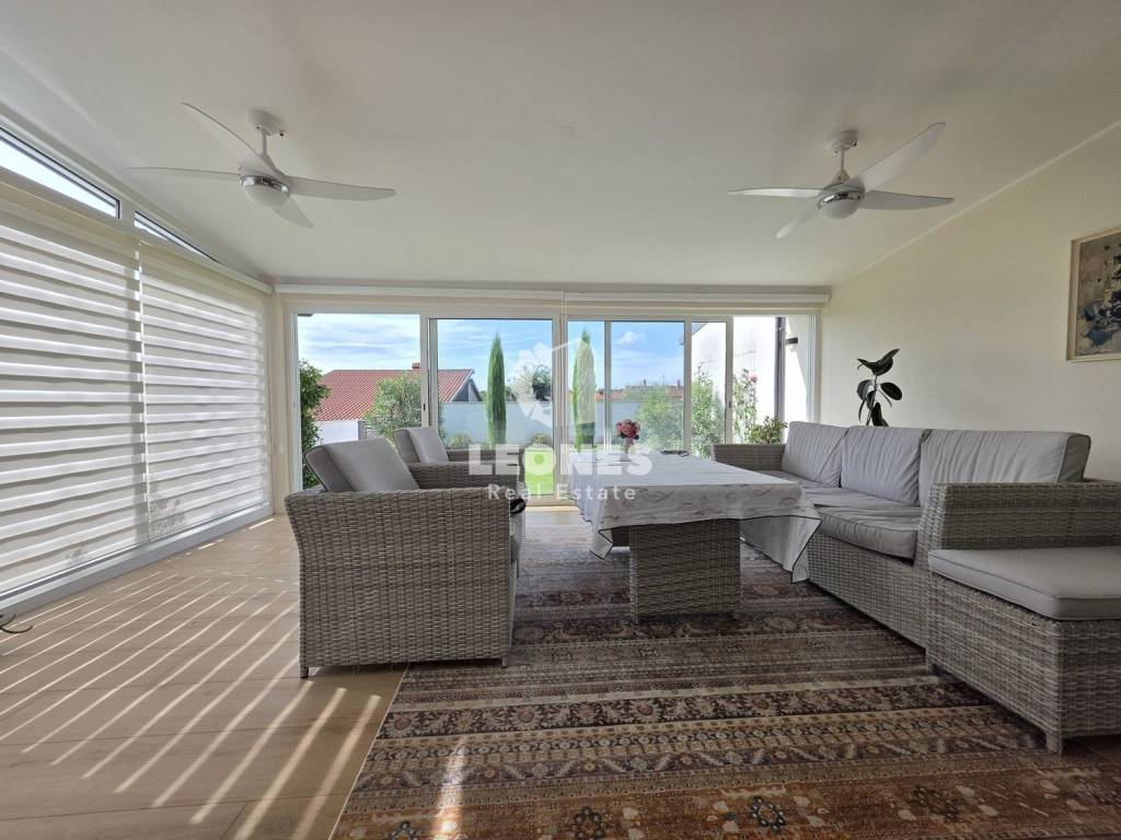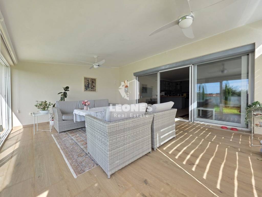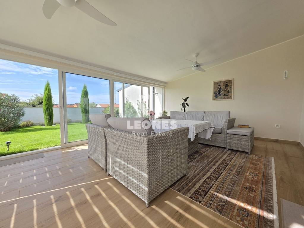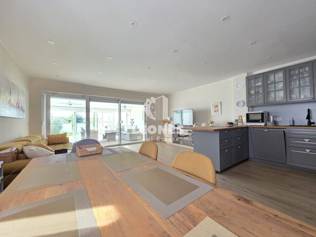 A new apartment with a garden in a quiet environment near Umag is for sale. The net usable area of the apartment is 100 m 2 (total NUA 138 m2) and consists of a living room and kitchen, 3 bedrooms, bathroom, toilet, enclosed terrace, 165 m2 garden, summer kitchen, storage room and two parking spaces. The terrace was subsequently enclosed and thus gained an additional room for living throughout the year.