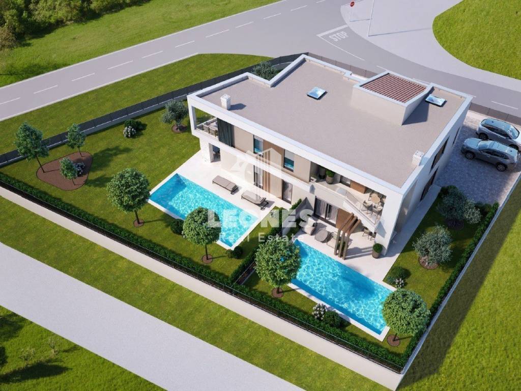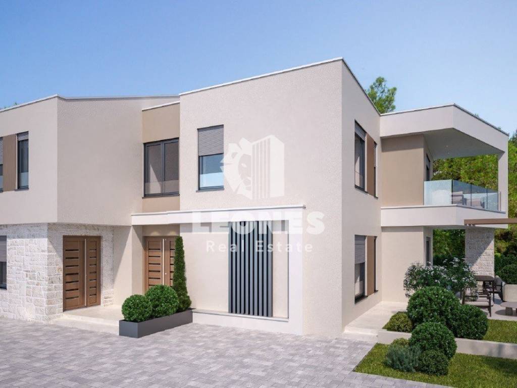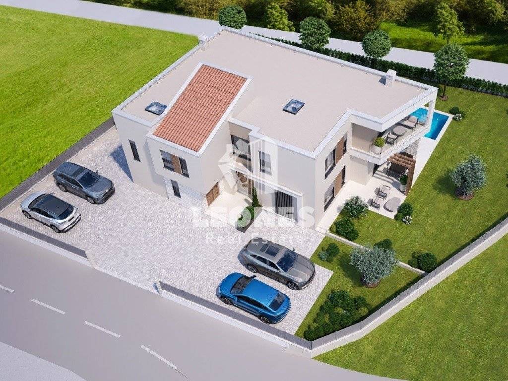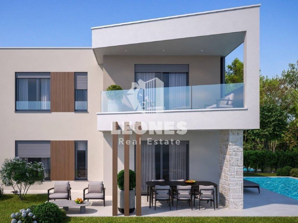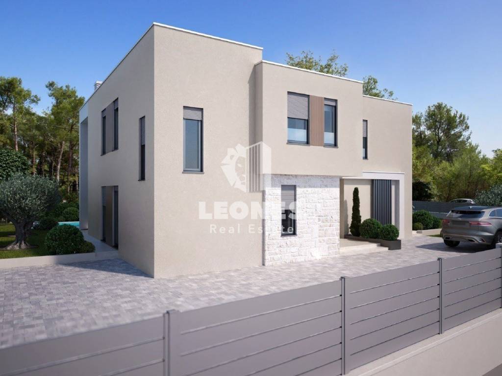 A modern semi-detached house with swimming pool near Umag is for sale. The net usable area of the house is 127 m2 while the land area is 374 m2. The ground floor consists of a living room, kitchen, bathroom, storage room and terrace while the first floor consists of 3 bedrooms, bathroom, wardrobe and a covered terrace.