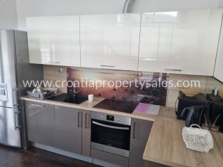 The inner part consists of 2 floors. At the bottom there is a kitchen, which is custom made, with all appliances included. Continuing to the right, we go down the stairs and come to a large living room and a larger bathroom. To the left of the kitchen, we enter the interspace, which leads to 2 bedrooms and one smaller bathroom.