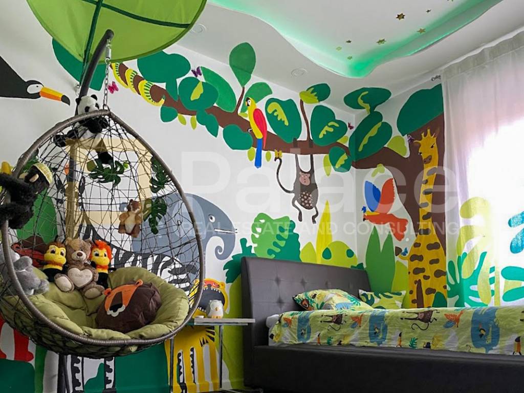 The apartment's special feature is the luxurious wellness room equipped with a jacuzzi for 2 people, a Finnish sauna for 4 people, a massage table, and ambient lighting. There is also a children's room styled like a "jungle" and a work/walk-in room.