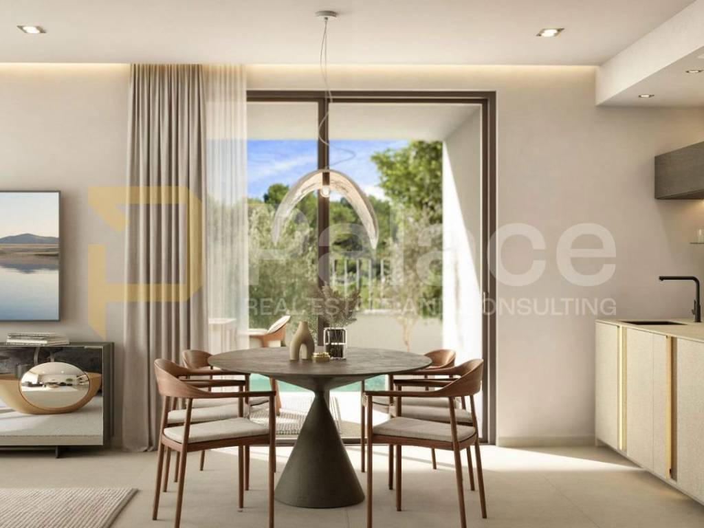 The spacious open-plan living area combines the kitchen, dining area, and living room into a unique, bright space filled with natural light thanks to the large glass walls that run throughout the entire apartment. Each room has access to a covered terrace of 53 m, ideal for relaxation, dining, and enjoying the view of the private garden.