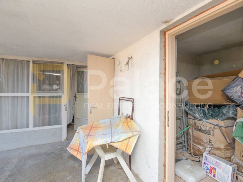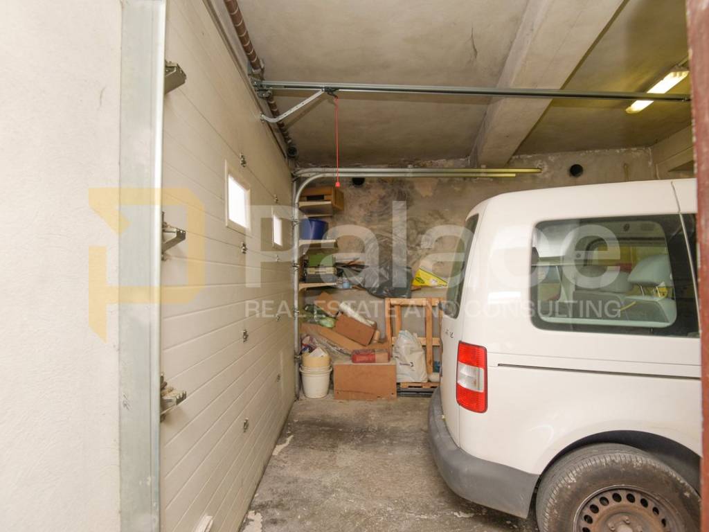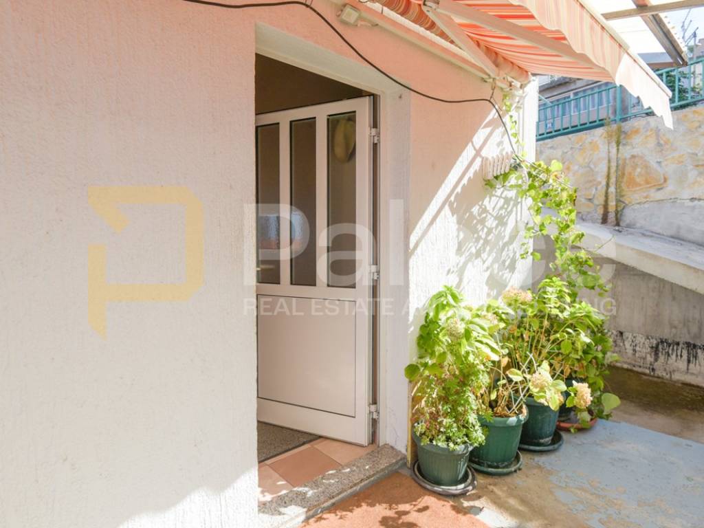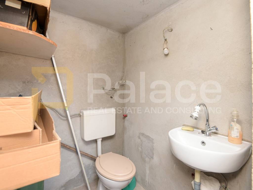 The house was built in the 1960s, has an occupancy permit, and consists of an entrance garage with roller doors from the street. Stairs lead to the basement where there is a large terrace with a small garden area and 3 rooms (summer kitchen, storage room, and toilet, which with a bit of creativity can be turned into a nice outdoor space). On the ground floor, there is a furnished and move-in ready apartment, renovated about 10 years ago, consisting of an entrance hall, kitchen, dining room with living room, hallway, 2 bedrooms, and a bathroom. Above is an attic that can be raised by 60 cm according to the Regulations for buildings constructed before 1968.