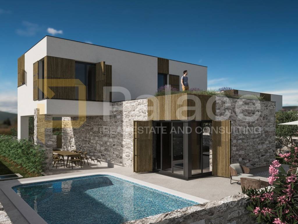 For sale is a modern luxurious villa with a pool and its own solar power plant in a beautiful location in the town of Zaton near Šibenik. This is a project consisting of a total of four modern villas, situated in a lovely location that offers privacy and a pleasant environment to its future owners.
