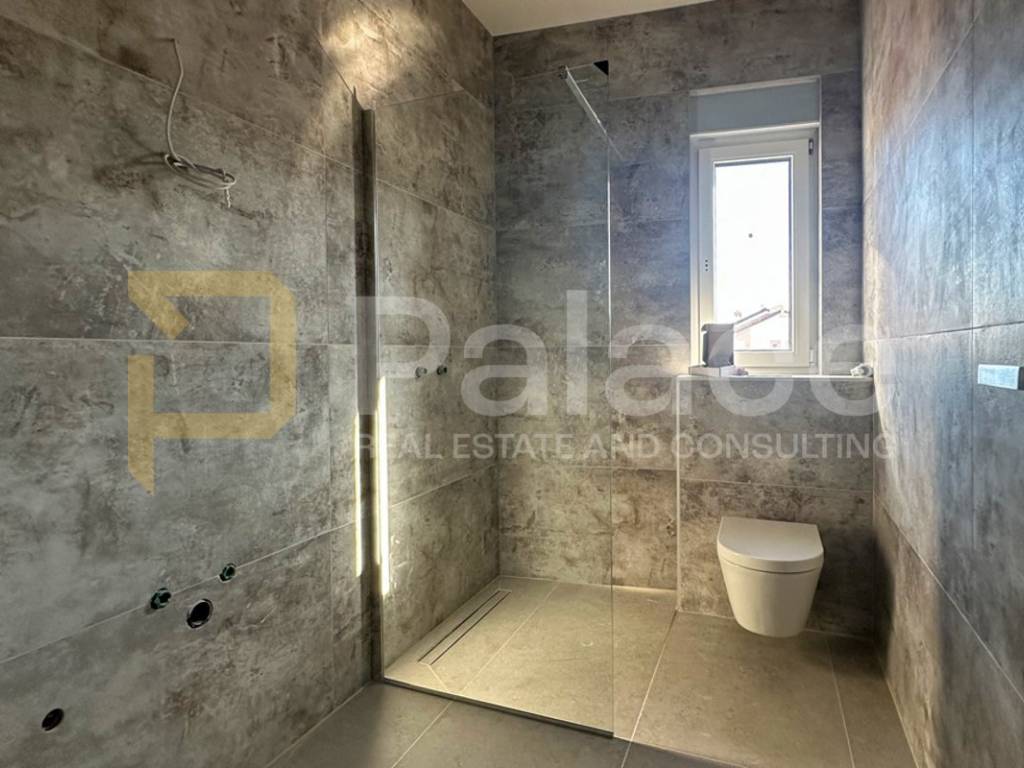 The indoor staircase leads to the roof terrace of 110 m (27.55 m calculated at a coefficient of 0.25), equipped with all the installations for a summer kitchen, WC, and jacuzzi, creating a perfect place for relaxation and enjoyment. The terrace is enclosed with elegant black glass, offering a charming panoramic sea view, ideal for enjoying sunsets.