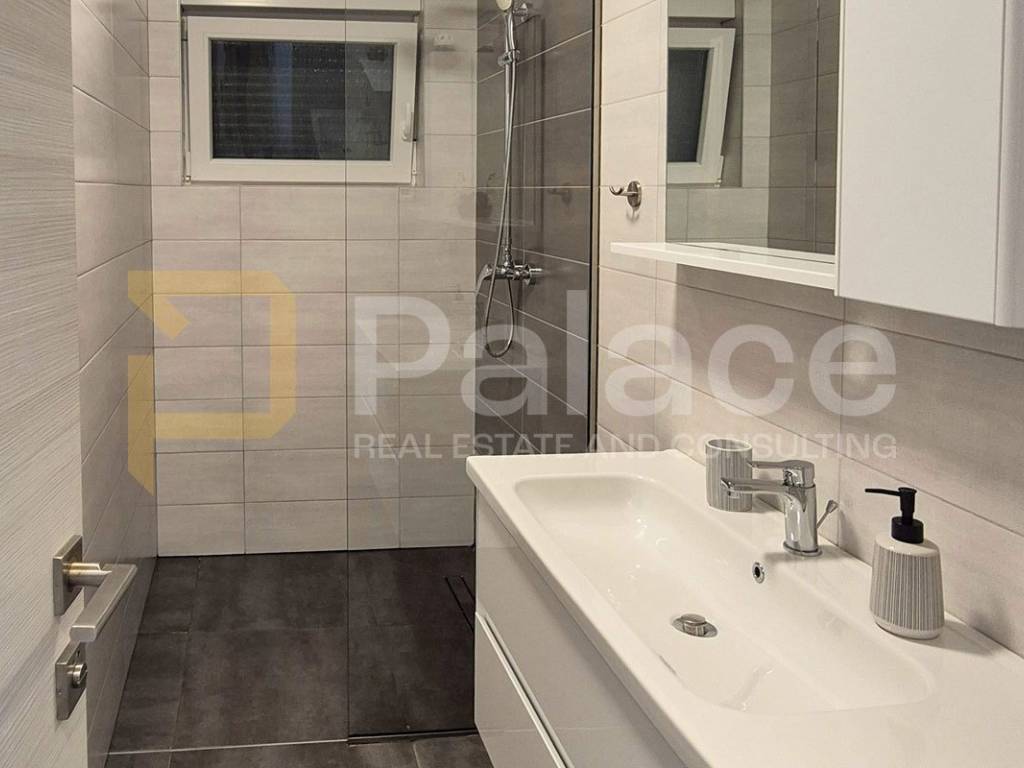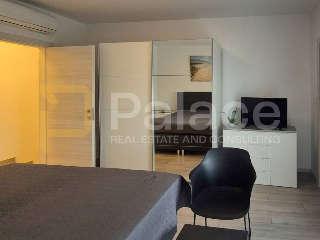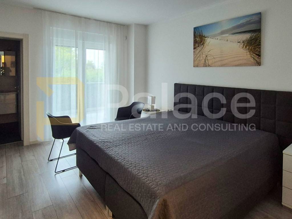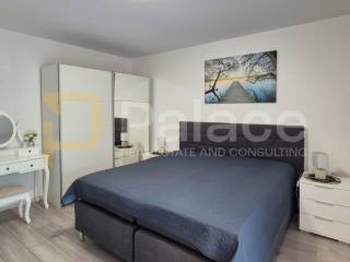 On the ground floor, there is a spacious open-space living room and kitchen, a storage room, one bedroom, and a bathroom. The living room and kitchen lead to a terrace that goes to the pool, perfect for enjoying summer days. On the second floor, there are two bedrooms, each with its own bathroom and balcony, ensuring additional privacy and comfort.