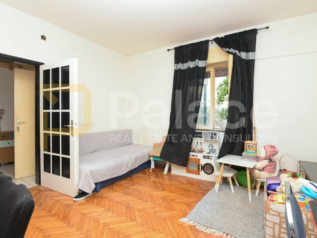 On the first floor, there is a spacious two-bedroom apartment of 86 m2. The apartment comprises a hallway, two bedrooms, one of which has access to a private balcony, a bathroom, a kitchen with dining area, and a spacious, bright, sunlit living room. The living room leads to a balcony overlooking the yard.
