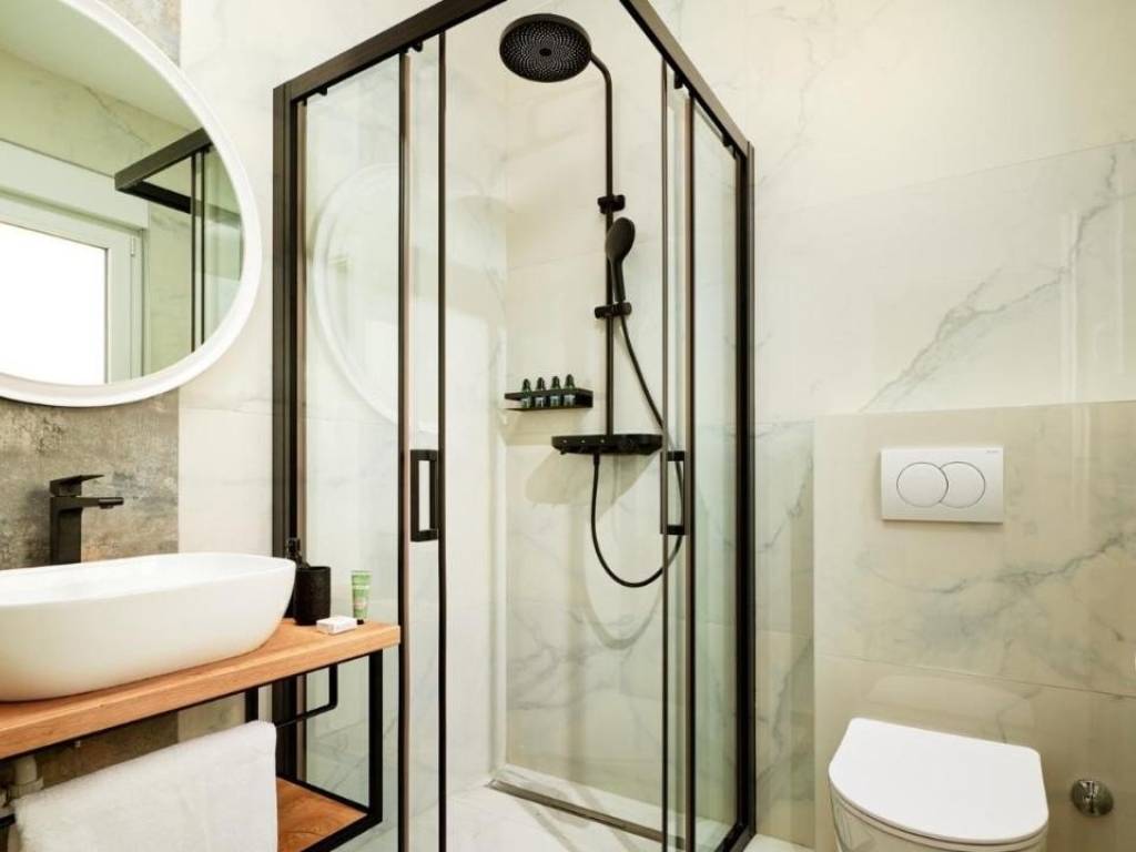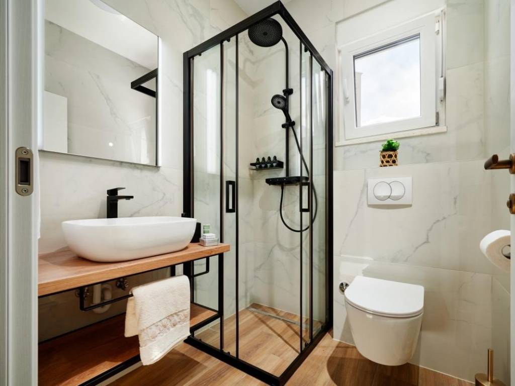 In the first unit, a two-story building, there are two separate apartments. The ground floor consists of an apartment with three bedrooms, each with its own bathroom and toilet, and a kitchen with a dining area. On the upper floor, there is an apartment with two bedrooms, each with its own bathroom and toilet, as well as a large living room and a kitchen with a dining area. From the living room, a bridge leads to a spacious terrace with a connection for a hot tub.