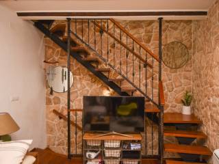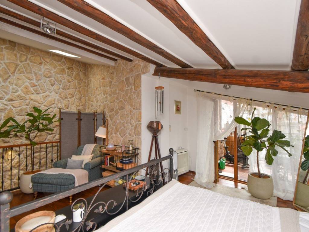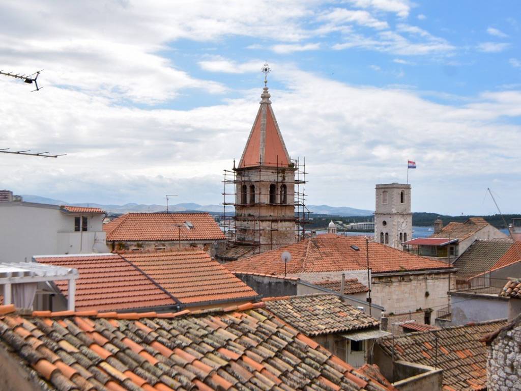 The external stairs lead to the first floor, where the upper comfortable apartment of approx. 108 m2 begins. On that first floor, there is a beautifully decorated kitchen and a bathroom with a bathtub. From there, wooden stairs lead to the second floor, where there is a living room and one bedroom, and on the next floor there is another spacious bedroom with an exit to the terrace, from where there is a view of Šibenik's old town roofs, churches and the sea.