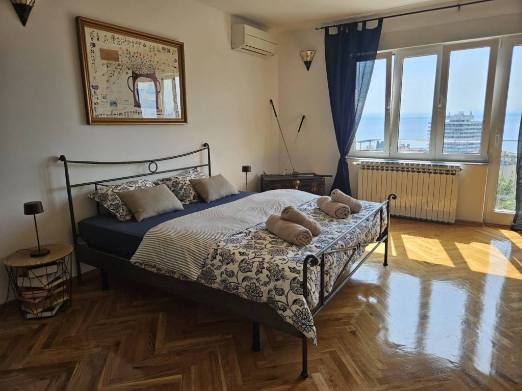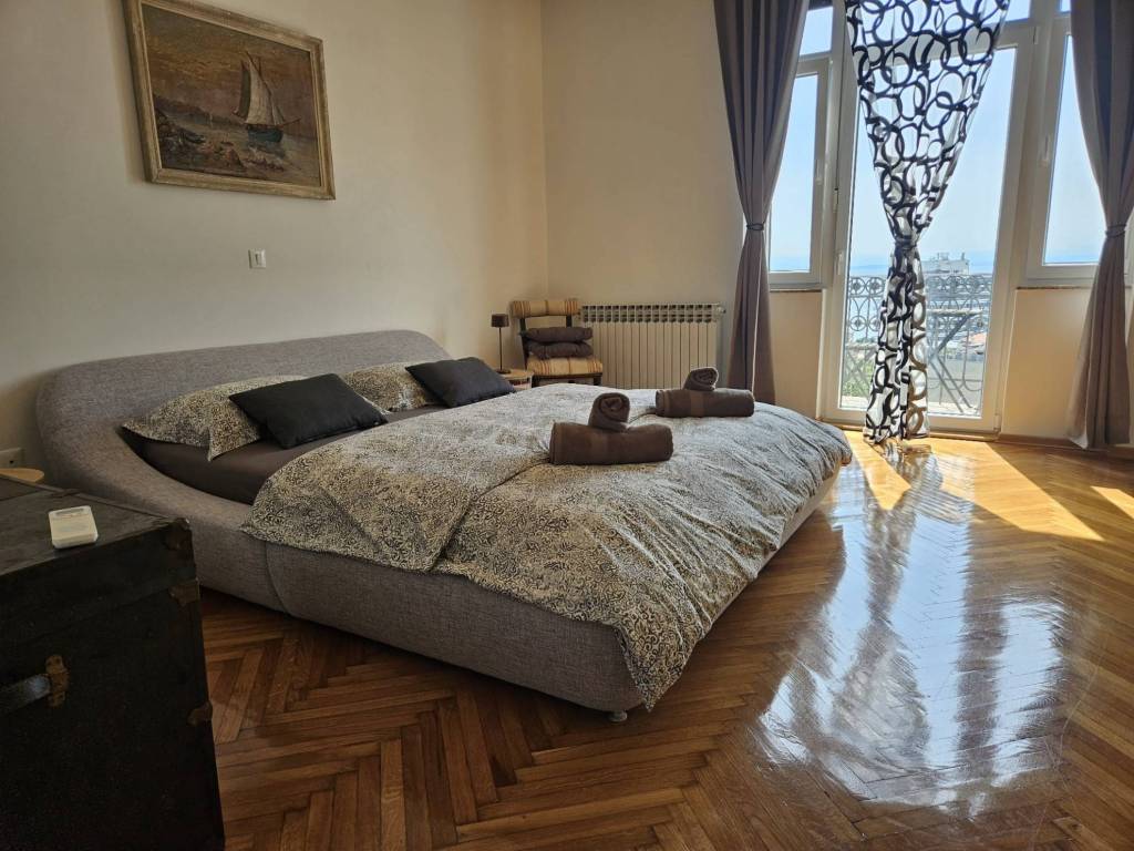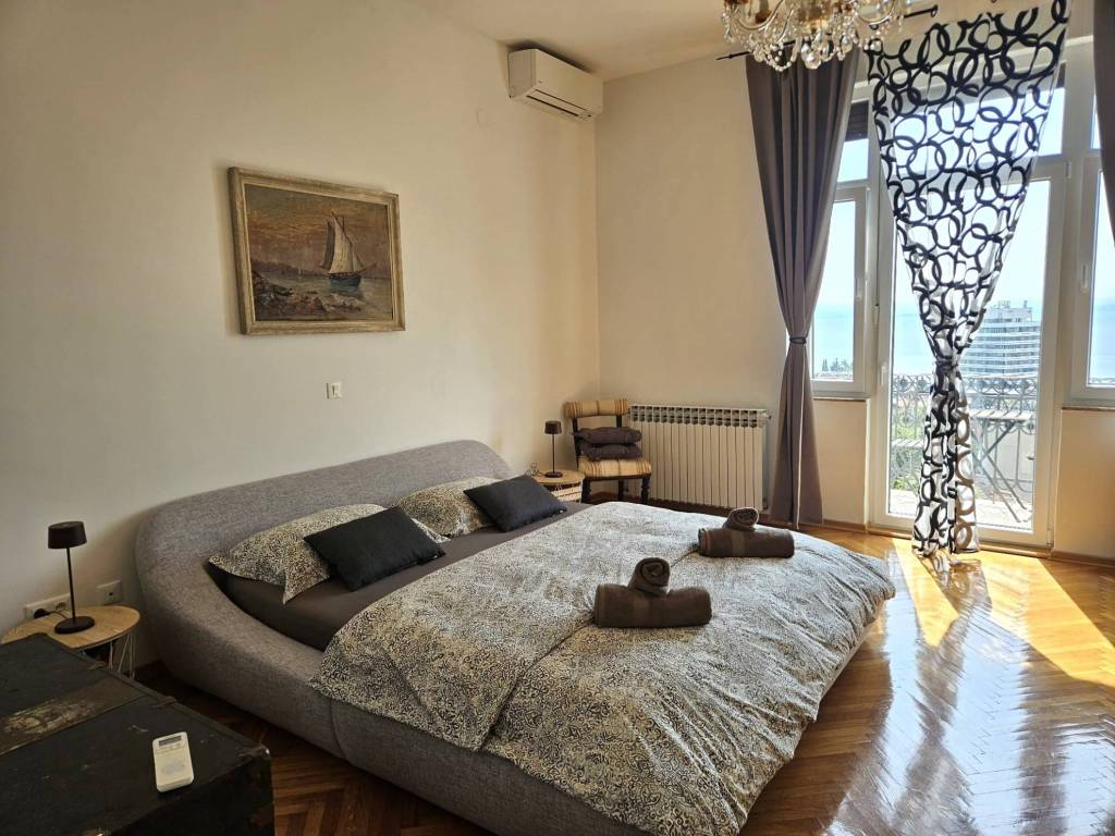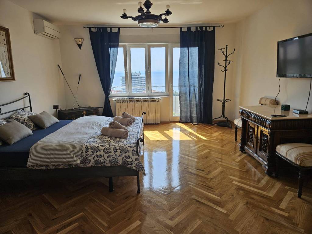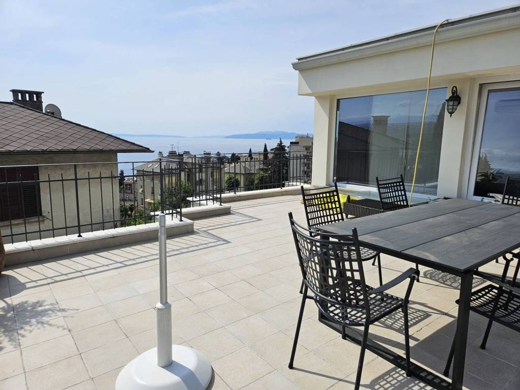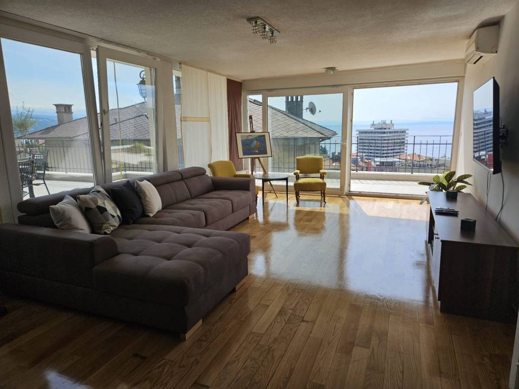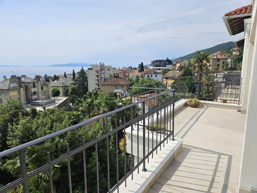 Beautiful, spacious apartment in an urban villa in the center of Opatija with a surface area of 210m2 offering a wonderful view of part of the city of Opatija and the sea. The interior space of the apartment, measuring 160m2, is nicely decorated and furnished, with the biggest asset of this property being the 50m2 large terrace and four balconies.