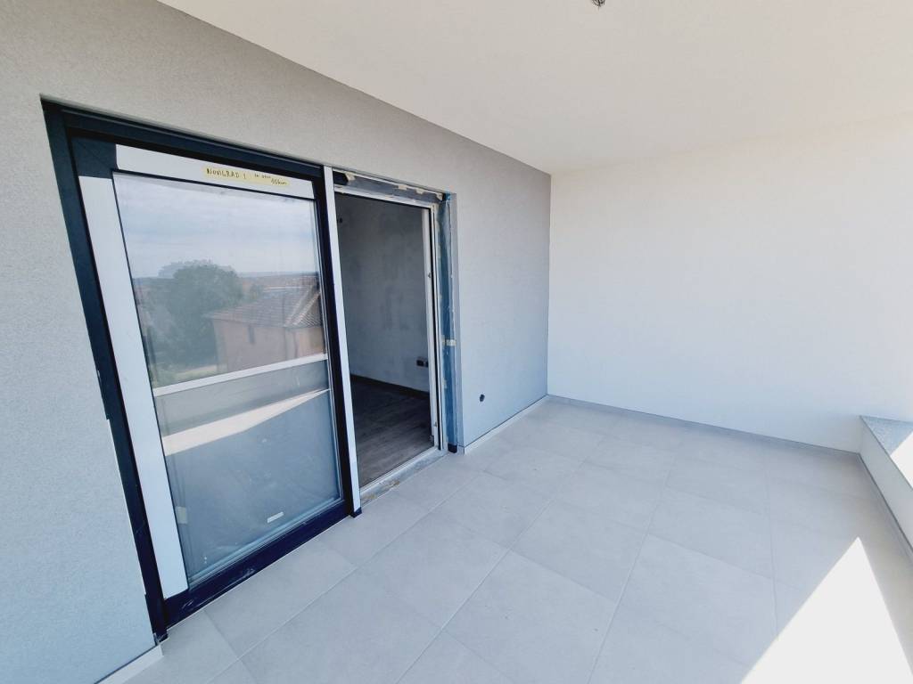One of the special features of the apartment is a large glass wall that allows plenty of light in the living area, and opens onto a covered terrace with a view of the sea.