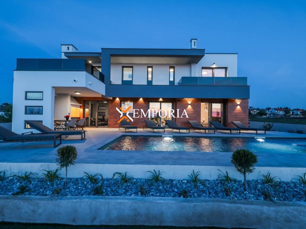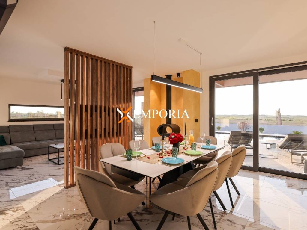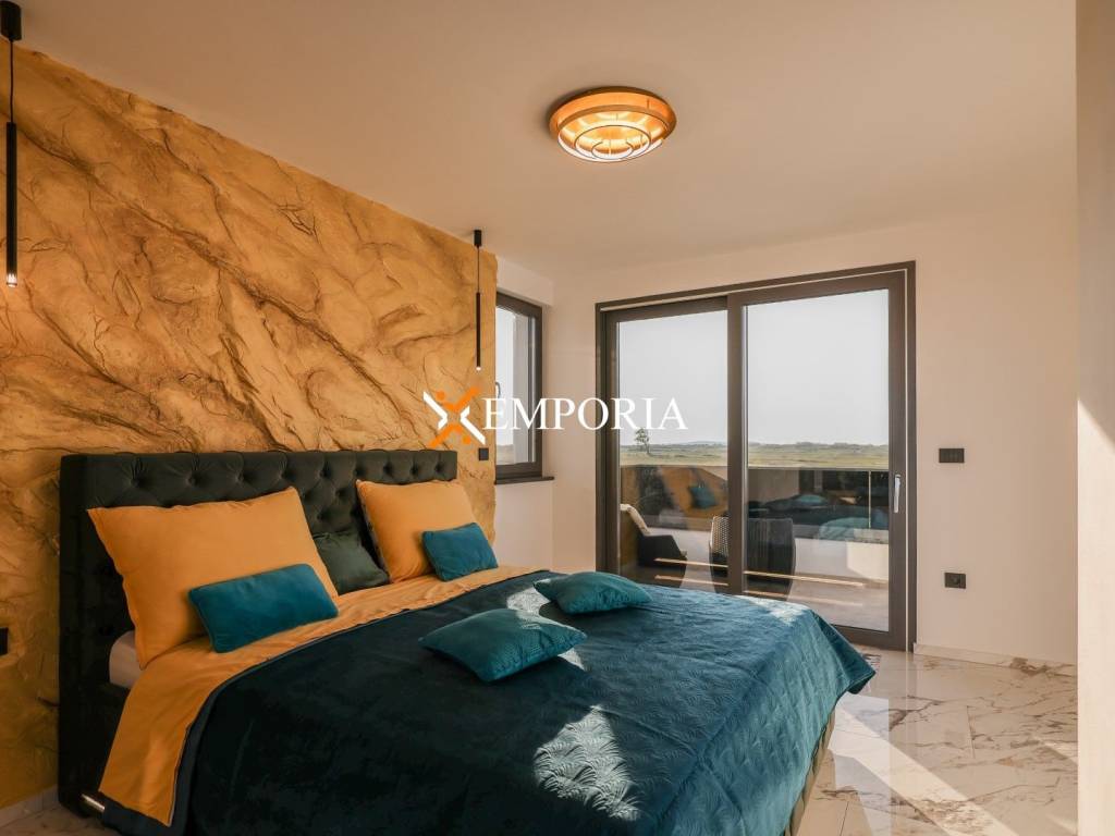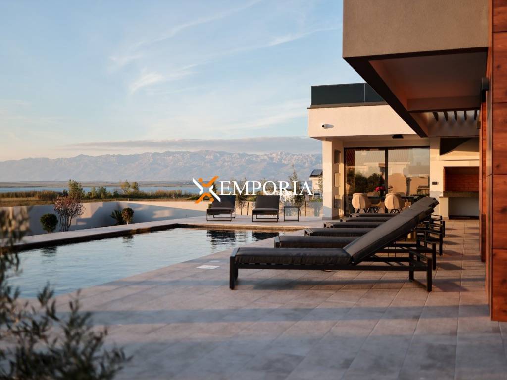 In Privlaka, in the Sabunike part, a luxury villa with a swimming pool is for sale. It is only 290 m to the sea. The house has one living unit and the complete equipment and furniture are included in the price. There is a beautiful sea view.