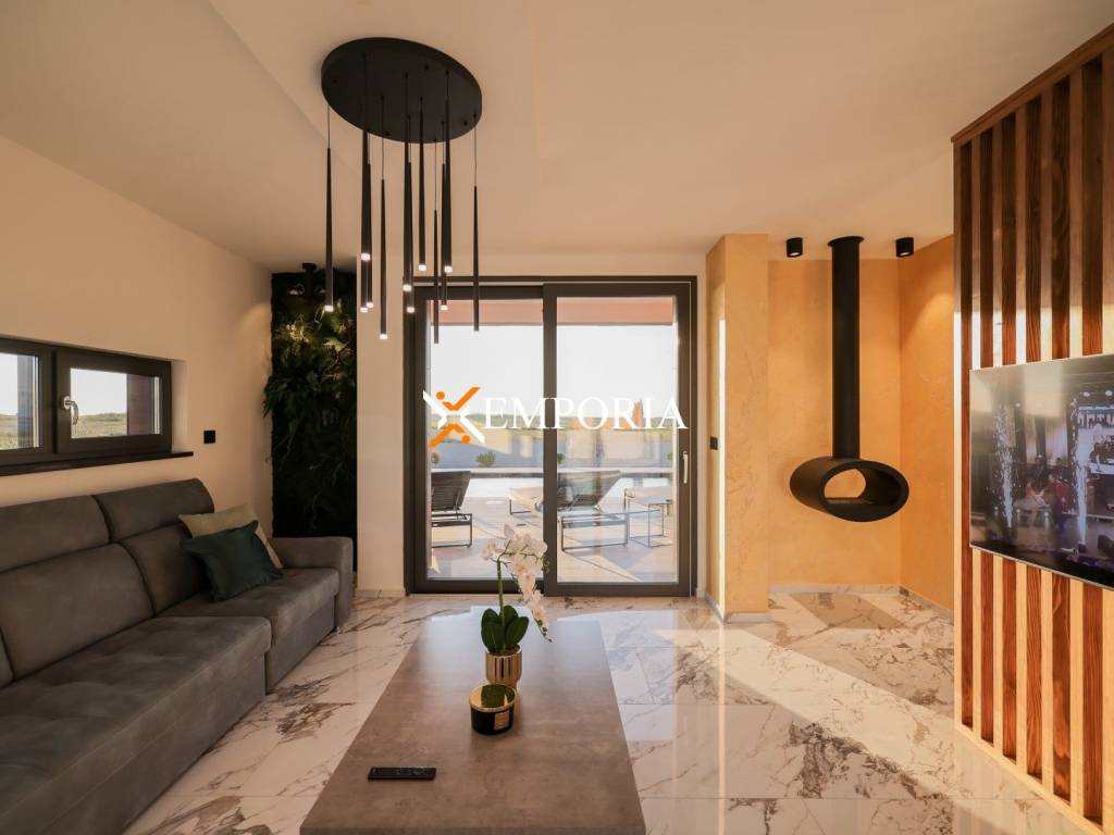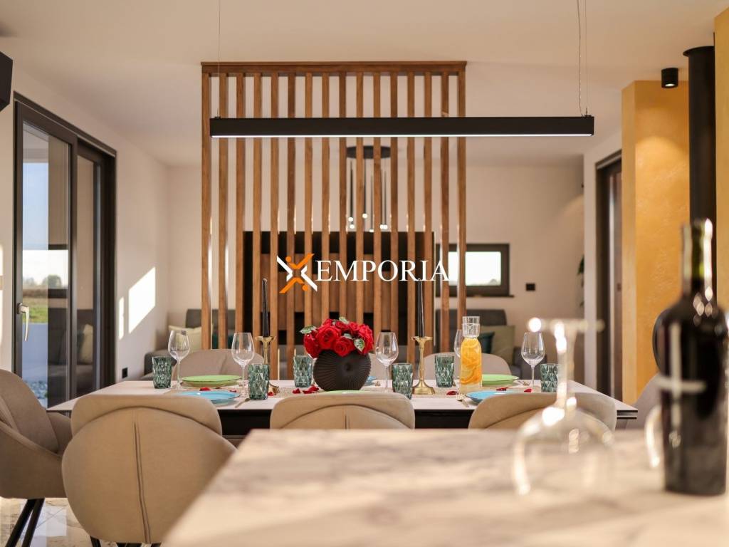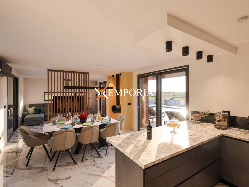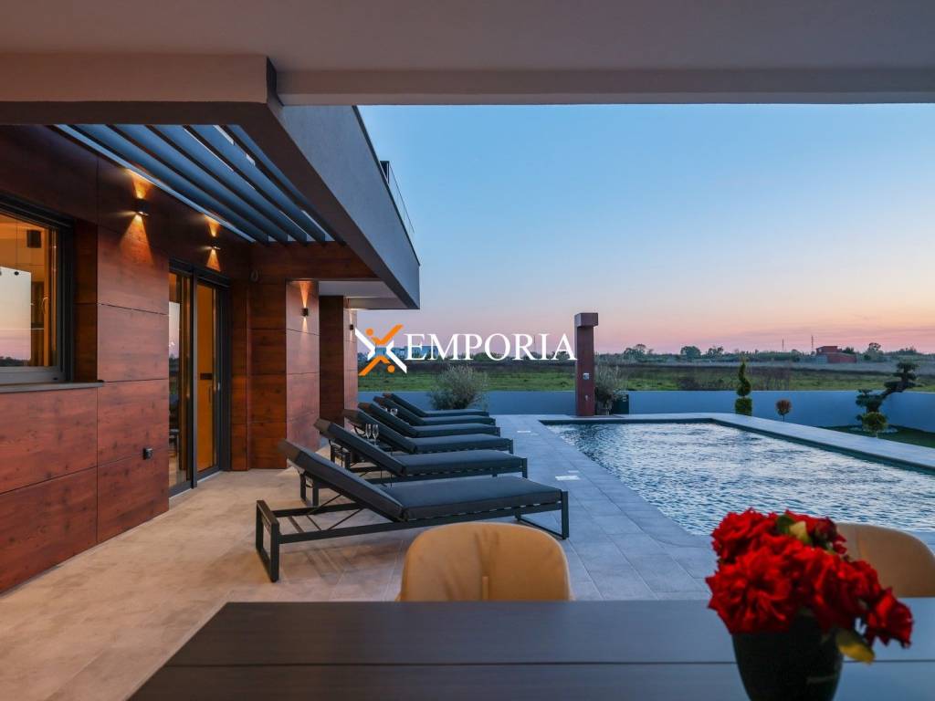 In Privlaka, in the Sabunike part, a luxury villa with a swimming pool is for sale. It is only 290 m to the sea. The house has one living unit and the complete equipment and furniture are included in the price. There is a beautiful sea view.