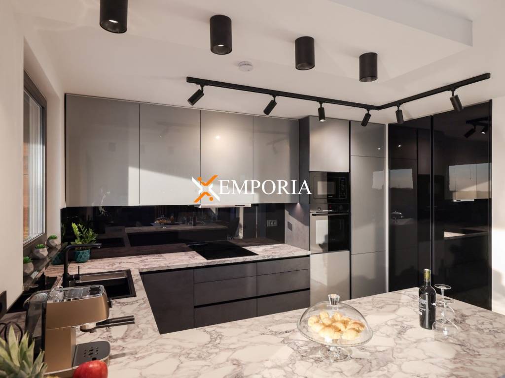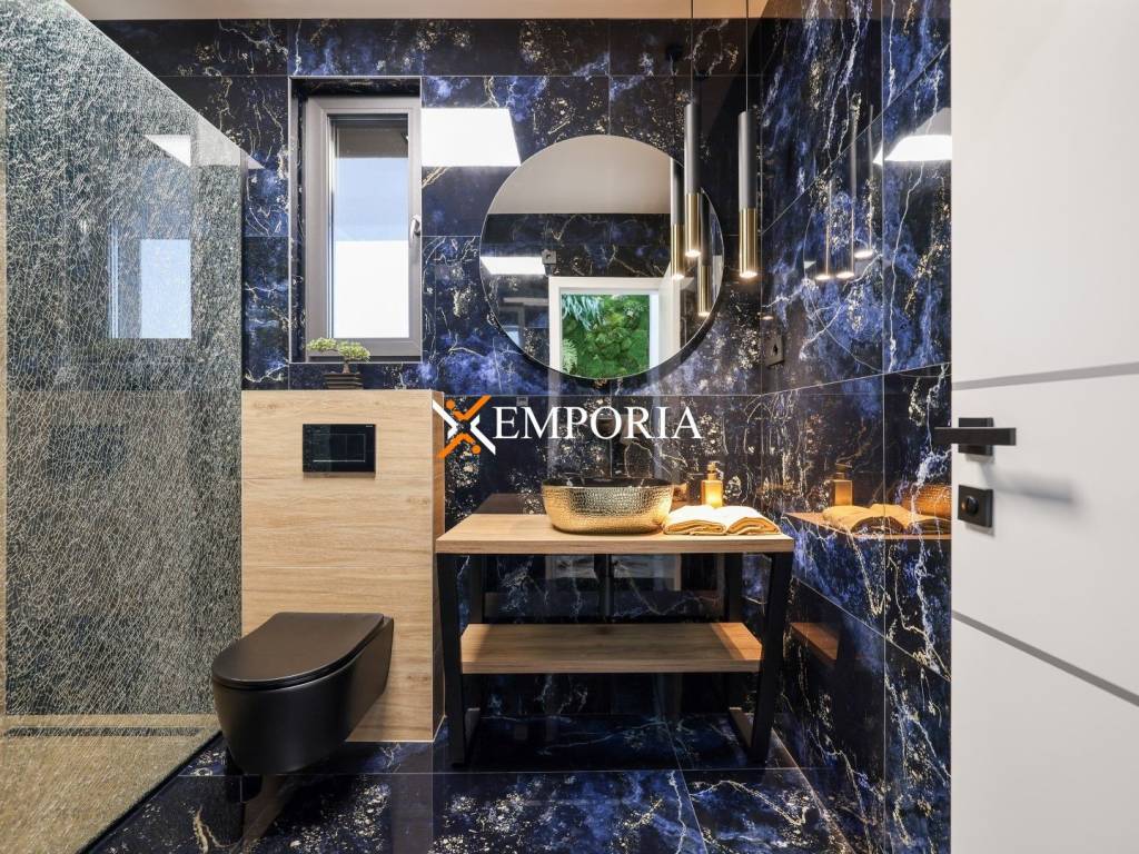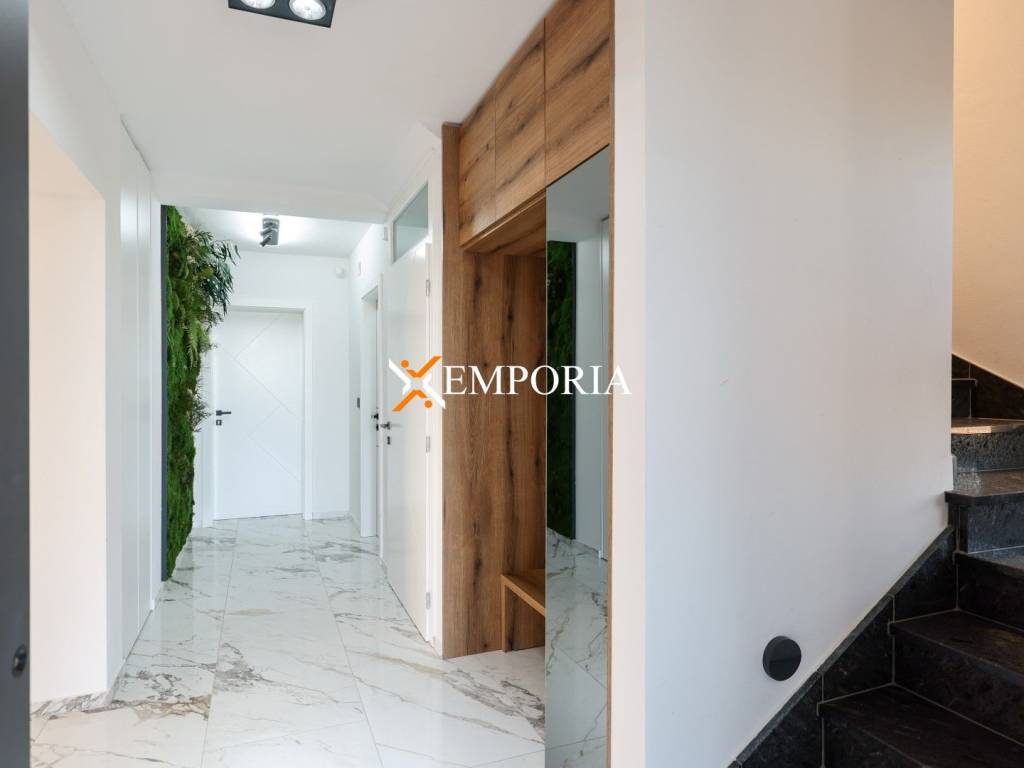 Underfloor heating via heat pumps throughout the house. Air conditioning in every room, also via heat pumps. There are solar collectors on the roof, which are used for water heating and heating of the house. The roof of the house is flat with 2mm TPO foil which is guaranteed for 10 years. Part of the ground floor facade is a ventilated facade with wood colored aluminum panels. There is an outdoor shower next to the pool. The swimming pool is heated. There is a charging station for electric cars in the parking lot. The front door is Schuco, it is not only burglar-resistant and fire-resistant, but also a security door. It opens with a fingerprint and a keyboard. Solid wood room doors.