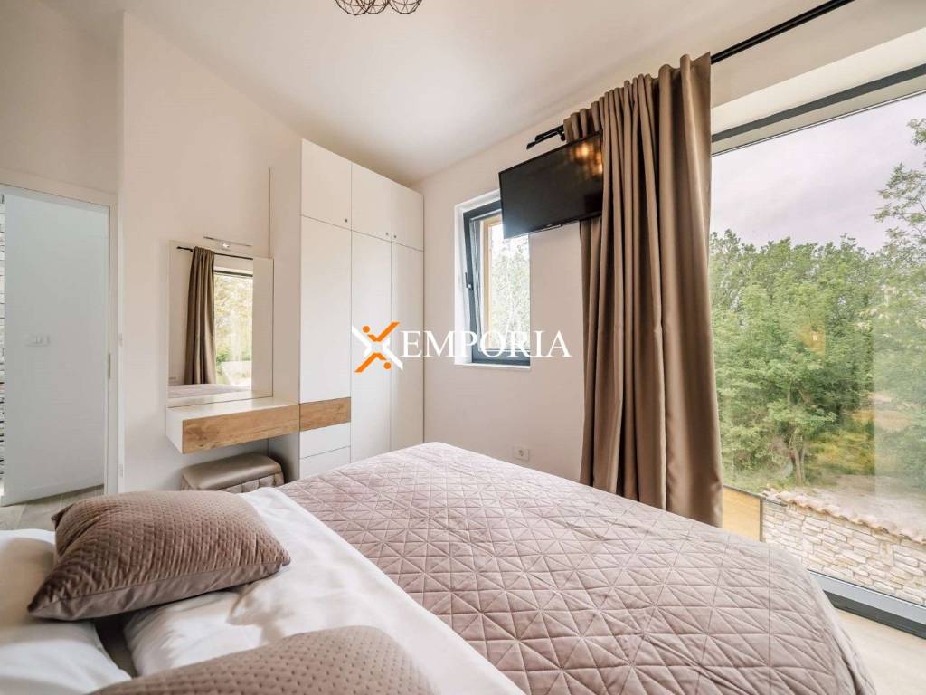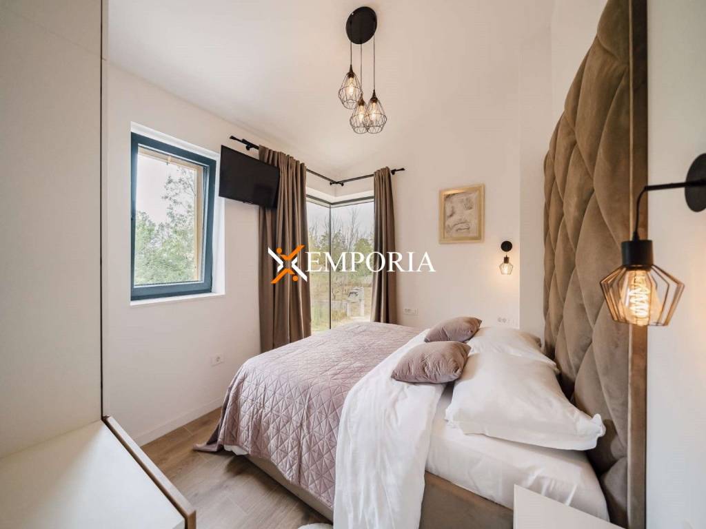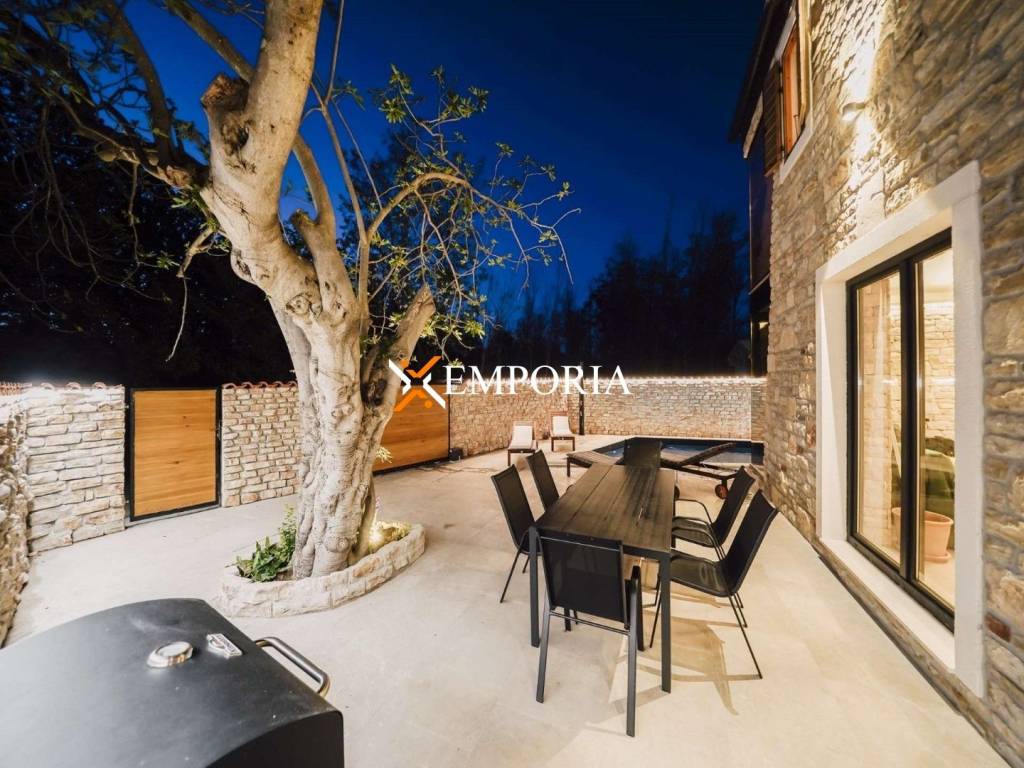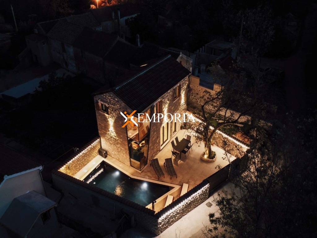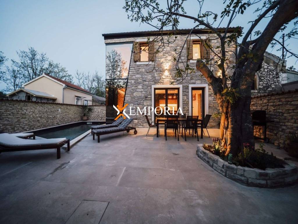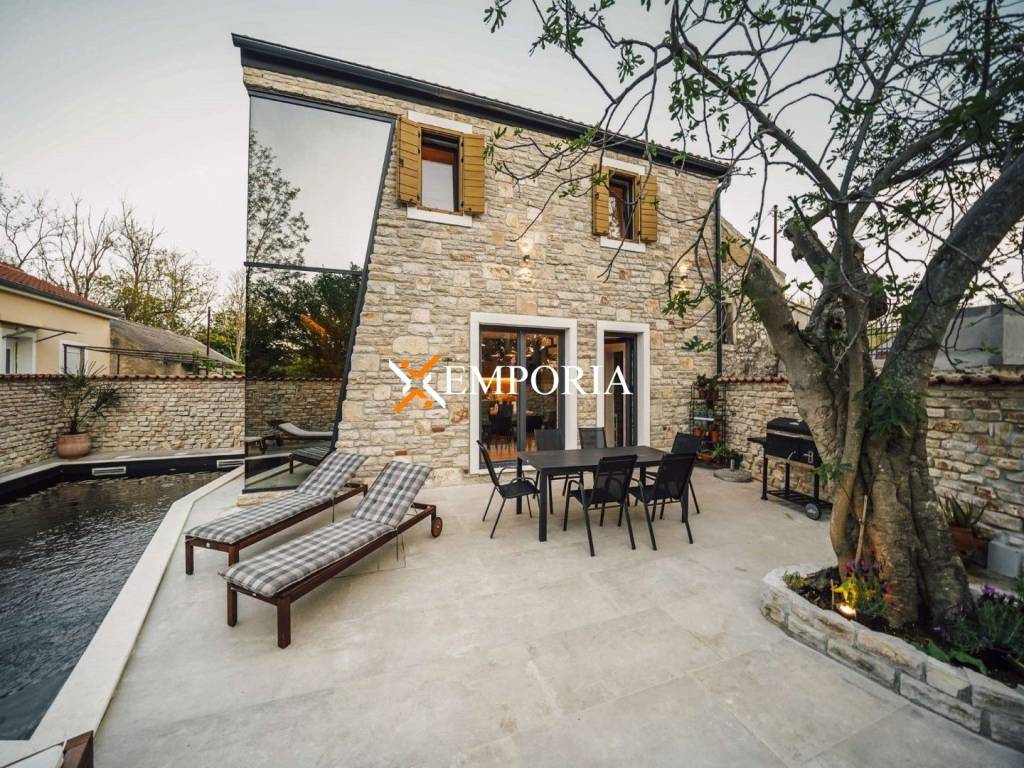 A new, modern Mediterranean-style house with a swimming pool is for sale in Privlaka. It is a property that perfectly combines modern architecture with traditional Dalmatian style. Particularly noteworthy are the beautiful stone facade and the large glass walls as well as the carefully landscaped and illuminated garden with swimming pool. The interior is also carefully decorated, and the house is sold fully furnished.