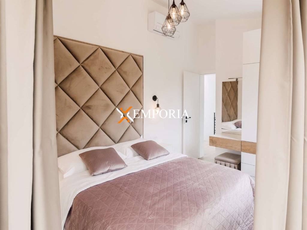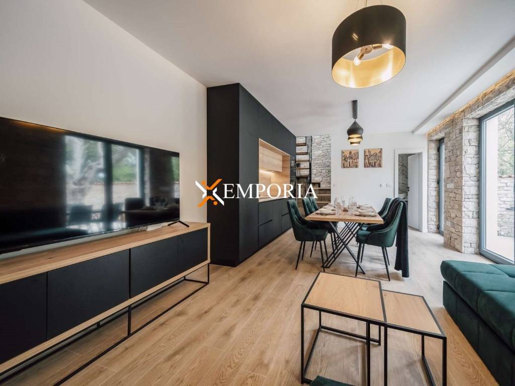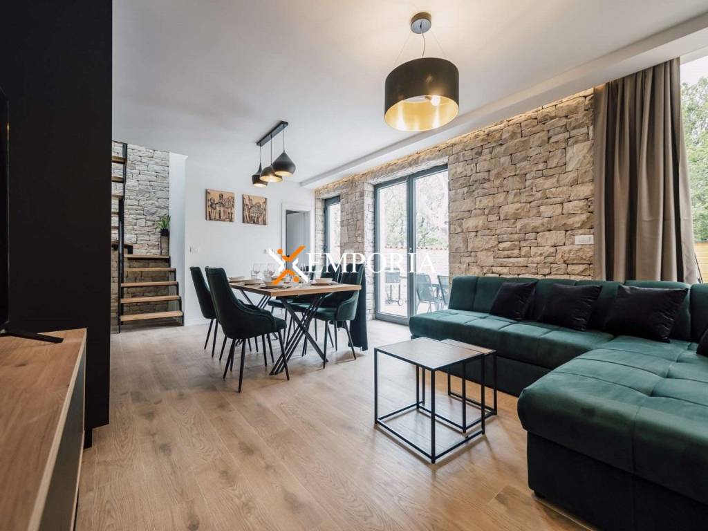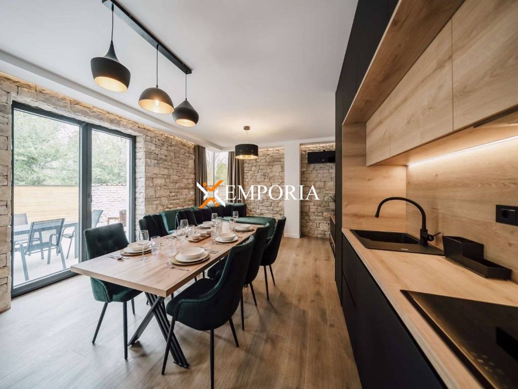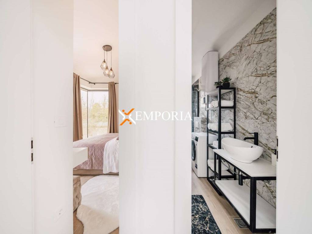 A new, modern Mediterranean-style house with a swimming pool is for sale in Privlaka. It is a property that perfectly combines modern architecture with traditional Dalmatian style. Particularly noteworthy are the beautiful stone facade and the large glass walls as well as the carefully landscaped and illuminated garden with swimming pool. The interior is also carefully decorated, and the house is sold fully furnished.