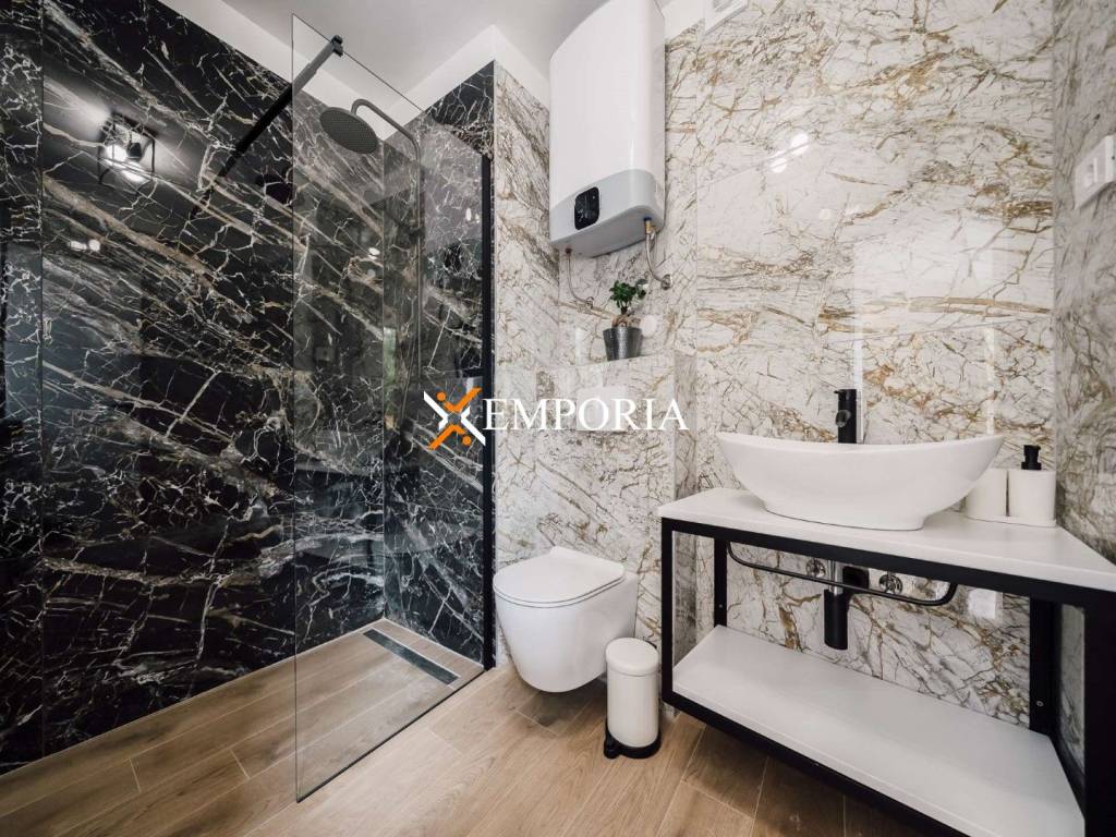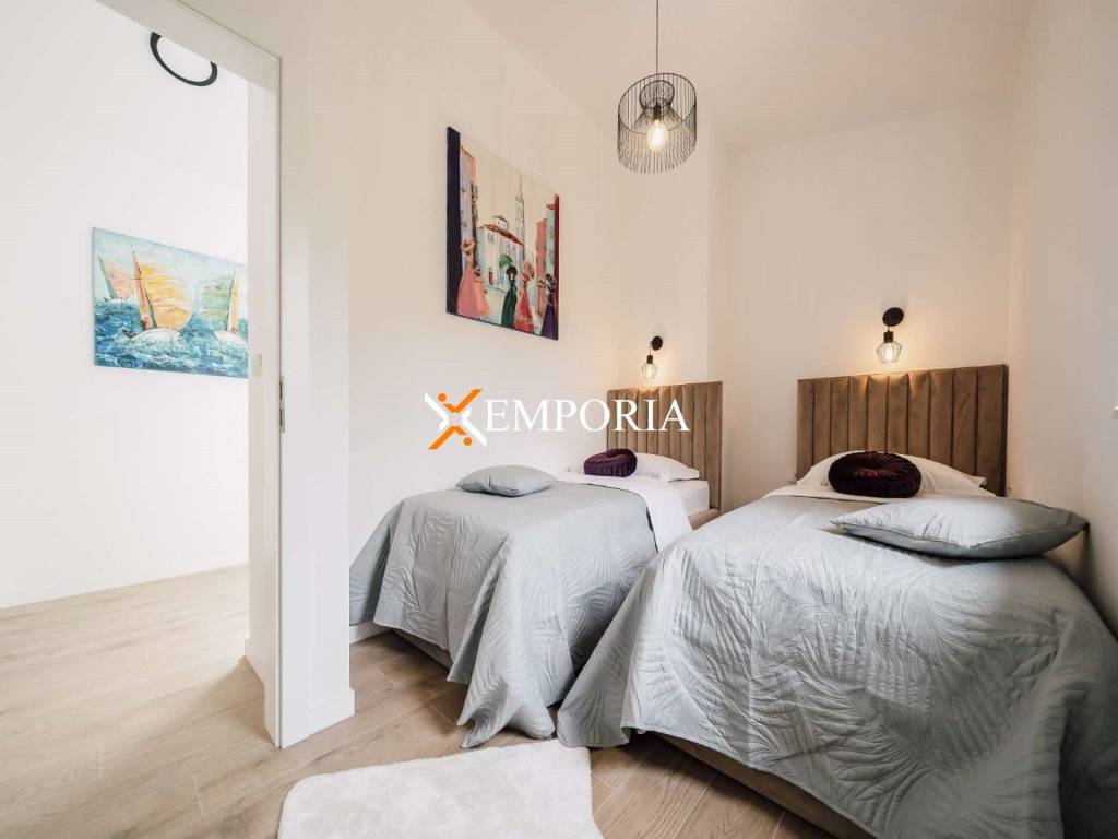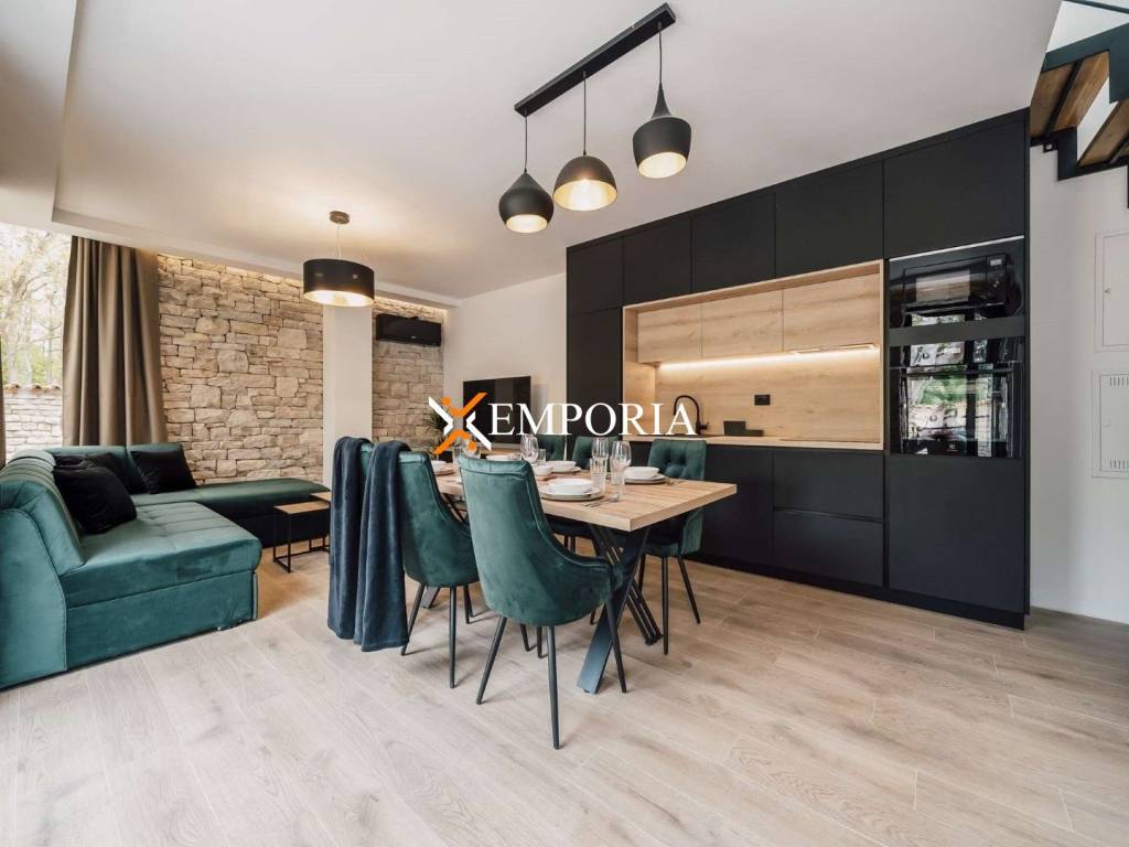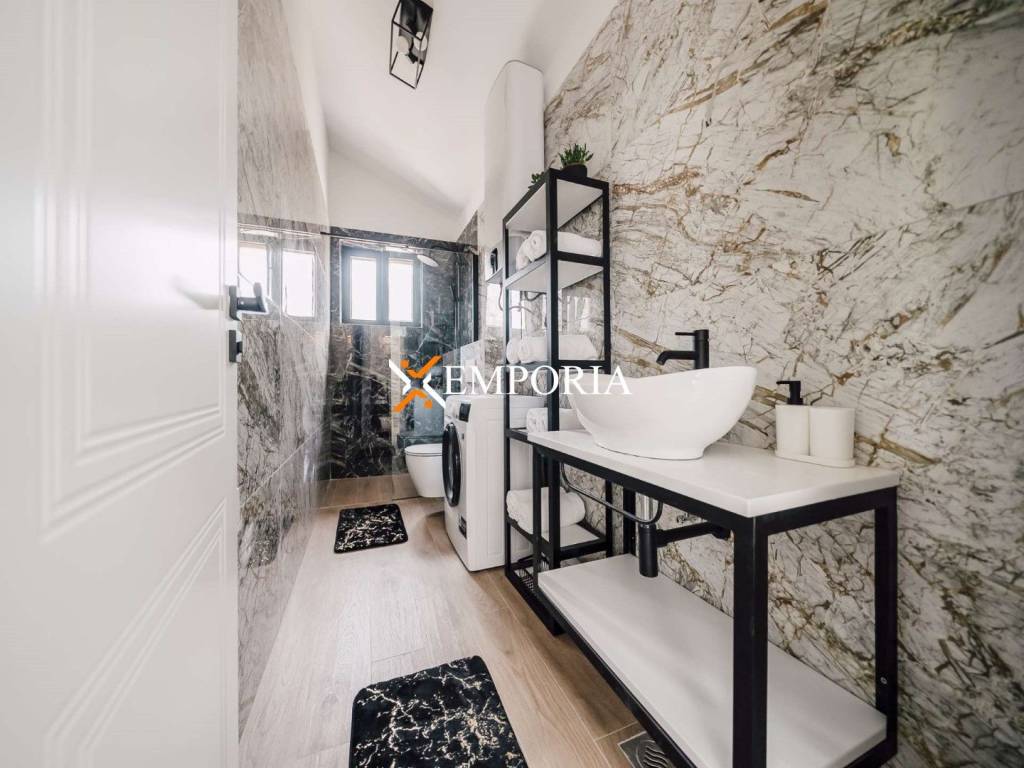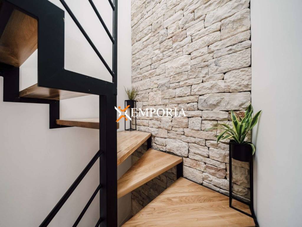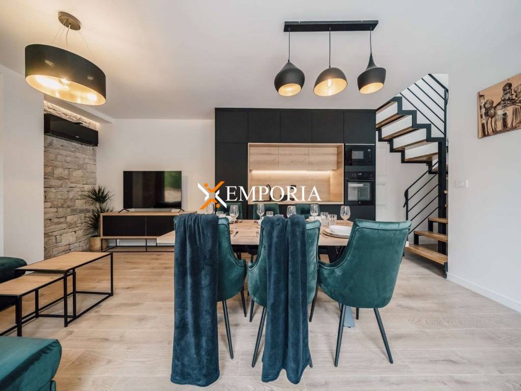 A new, modern Mediterranean-style house with a swimming pool is for sale in Privlaka. It is a property that perfectly combines modern architecture with traditional Dalmatian style. Particularly noteworthy are the beautiful stone facade and the large glass walls as well as the carefully landscaped and illuminated garden with swimming pool. The interior is also carefully decorated, and the house is sold fully furnished.