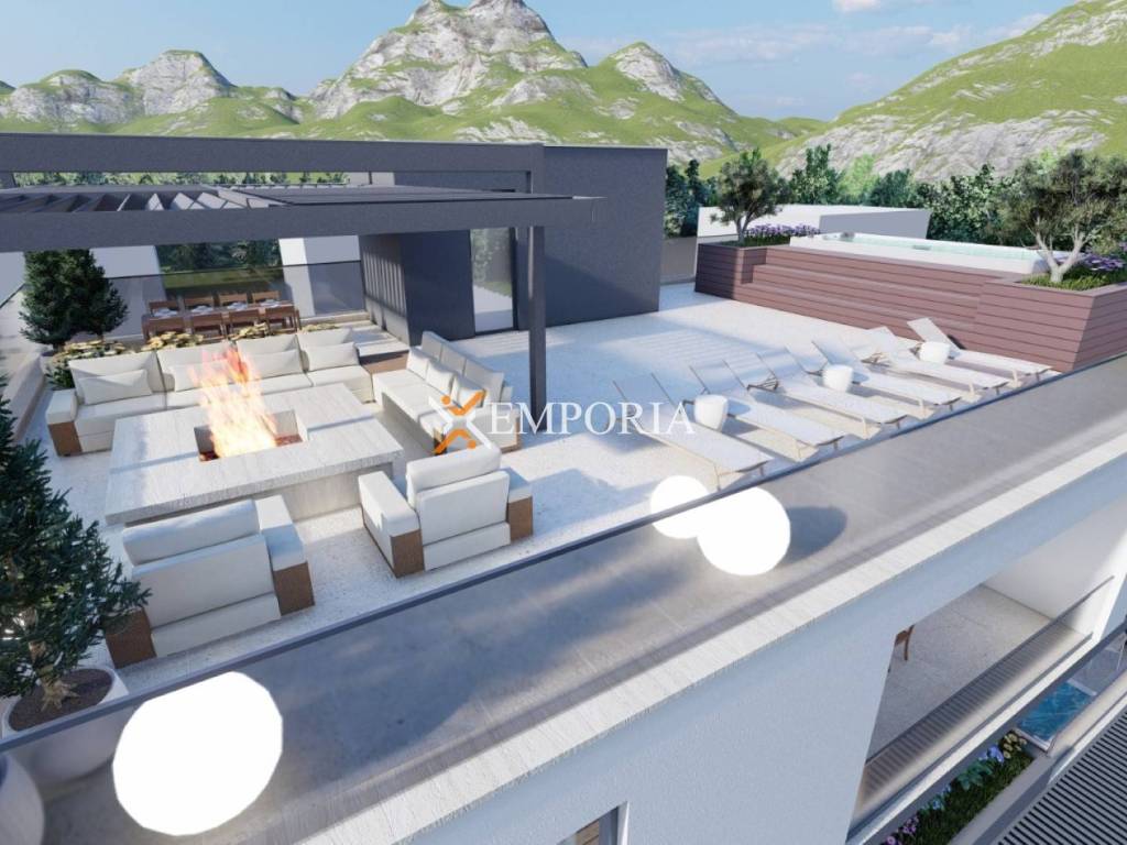 Internal stairs lead to a spacious roof terrace with an area of 197,45 m2. The total net usable area of the apartment with roof terrace is 249,10 m2.