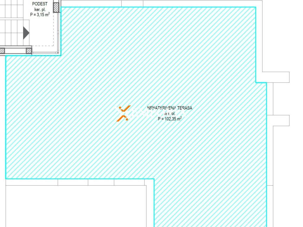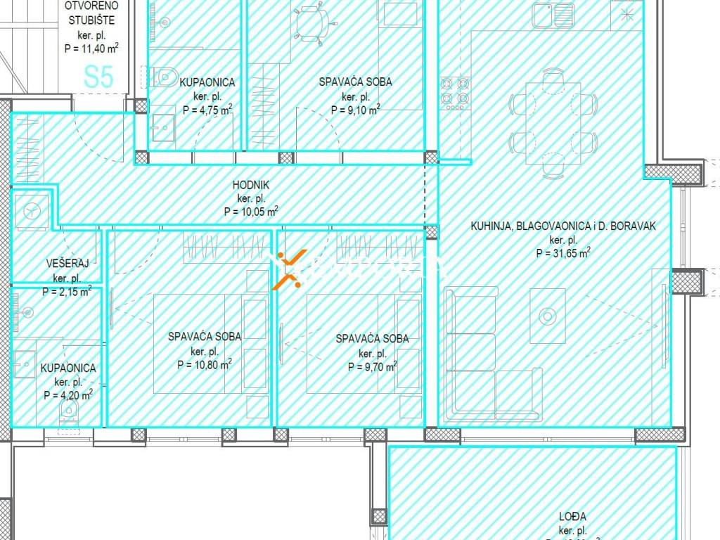 The apartment consists of a hallway, two bedrooms, a third bedroom with its own bathroom, an additional bathroom, a laundry room, and a kitchen with dining and living area. From the living area, there is access to a loggia, and from the staircase, there is access to a spacious rooftop terrace of 102.35 m², making this property perfect for enjoyment and relaxation.