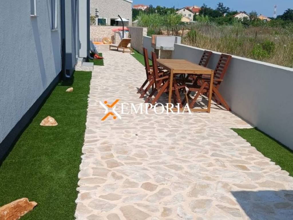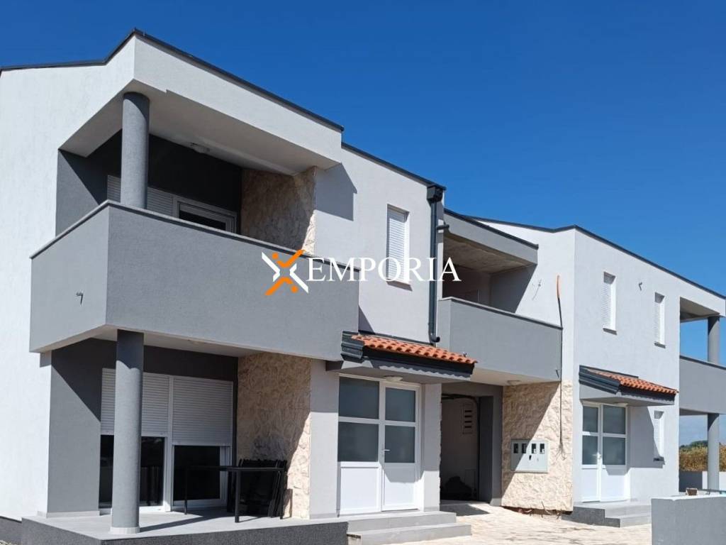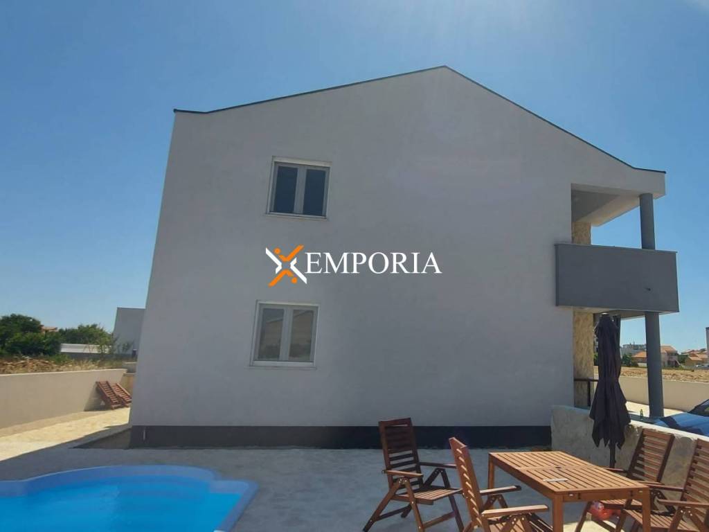 In a quiet location in Privlaka, just 240 m from the sea and 200 m from the town center, a modern house with a total of five apartment units, a private pool, and a spacious yard is for sale. It is situated on a 575 m² plot, and the total net usable area of the house with the pool is 297.14 m².