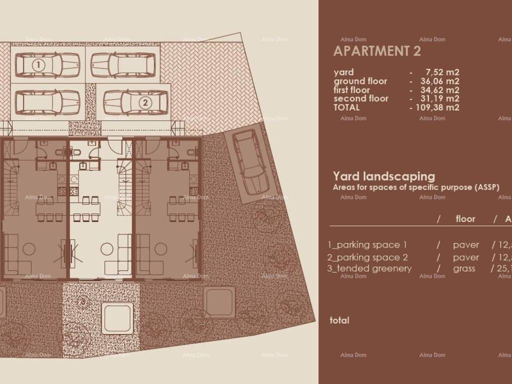 Apartment 2, with an area of 109.38 m, includes the ground floor, first floor, and second floor.