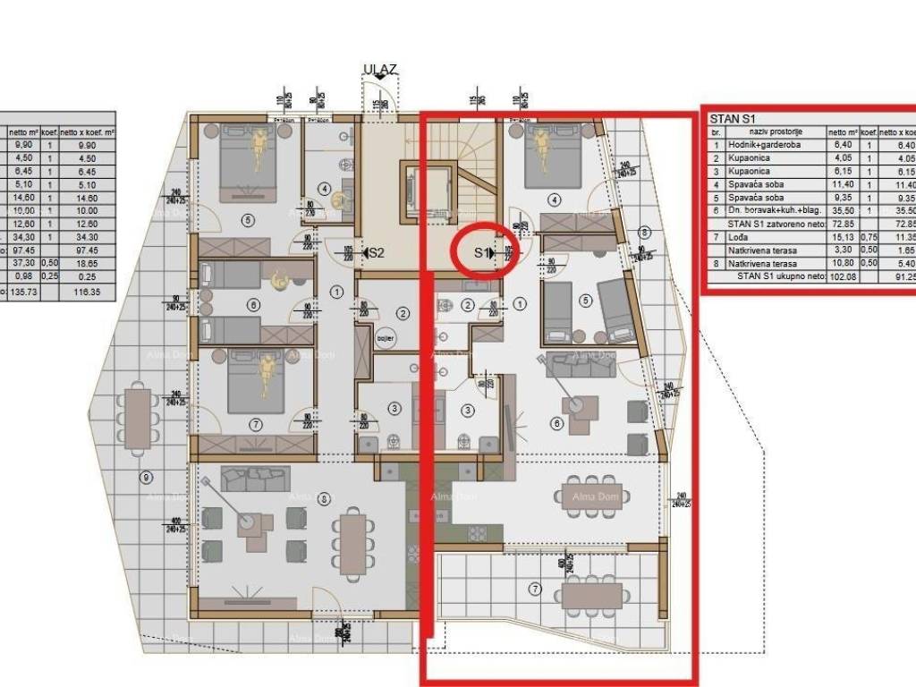 Apartment S1 is located on the ground floor of building B, with an area of 102.08 m2 (net area of 91.25 m2) and comprises: a hallway with a wardrobe, 2 bedrooms, 2 bathrooms, a living room with a kitchen and dining area, as well as a spacious loggia and covered terrace. The apartment has a garden of 40 m2 (net coefficient 4 m2).