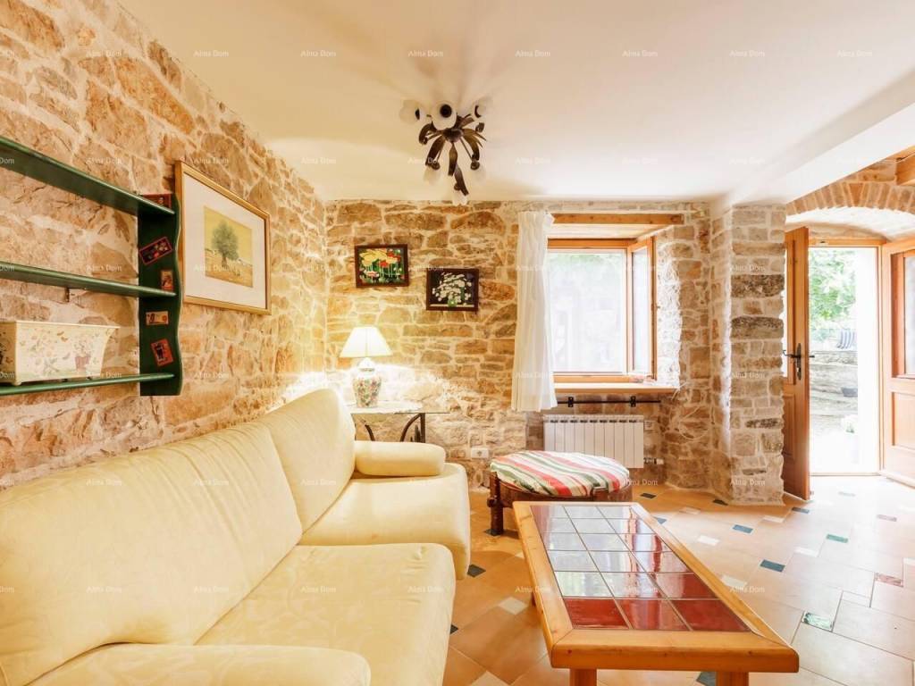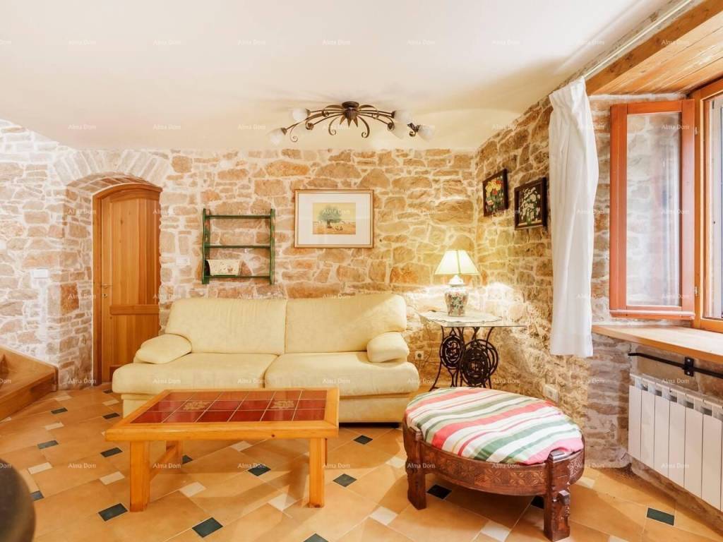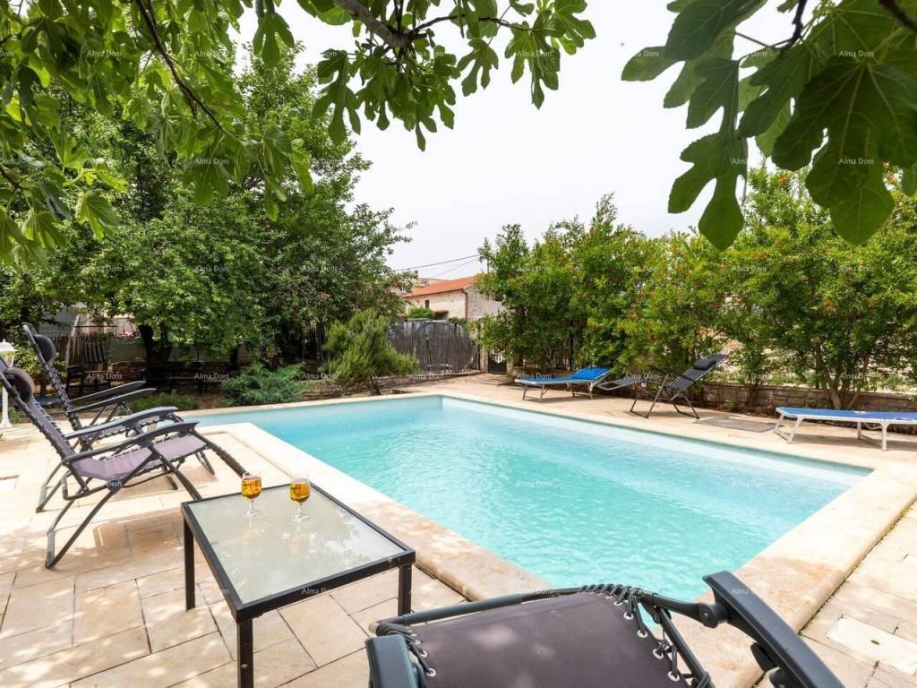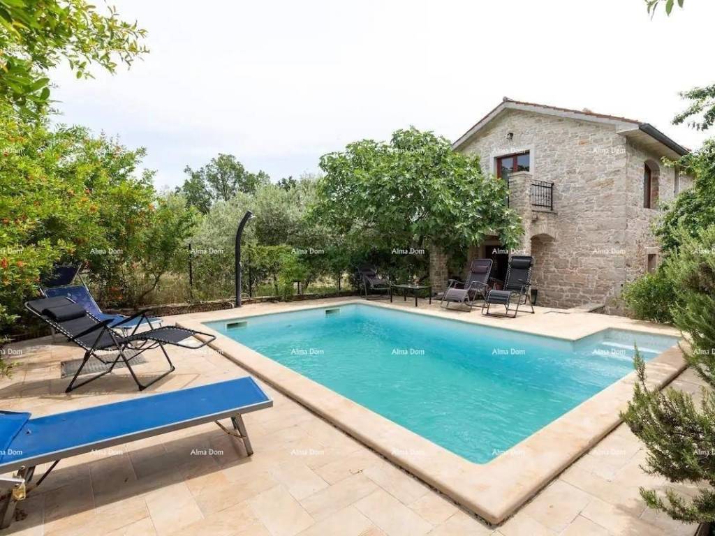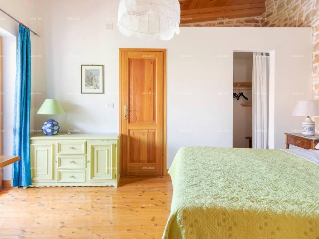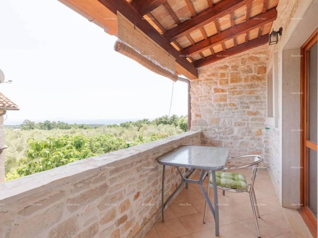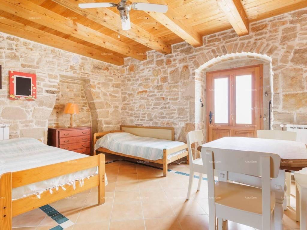Two stone houses with a swimming pool, Istria, 20 km from Pula, 2.5 km from the sea. Beautifully renovated and furnished, sea view, with terraces and porches. 7 bedrooms with private bathrooms, air conditioning on the upper floors, 2 kitchens and 2 living rooms, barbecue, private parking. This is a single property consisting of 2 stone buildings with sea and pool views. the garden is partly in the shade of figs and yellow plums that ripen alternately from May to October. The garden is located between two buildings and allows you some privacy even if the house is located in the village. There are two tables outside that allow you to meet in the shade of the porch. 5 rooms have a private outdoor space that also allows you to isolate yourself from others.