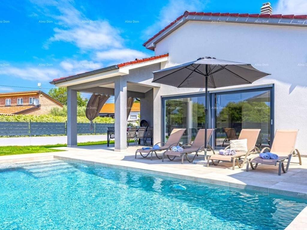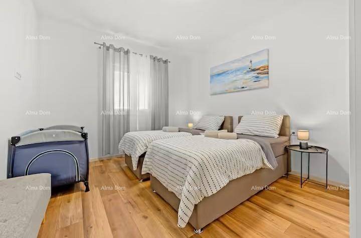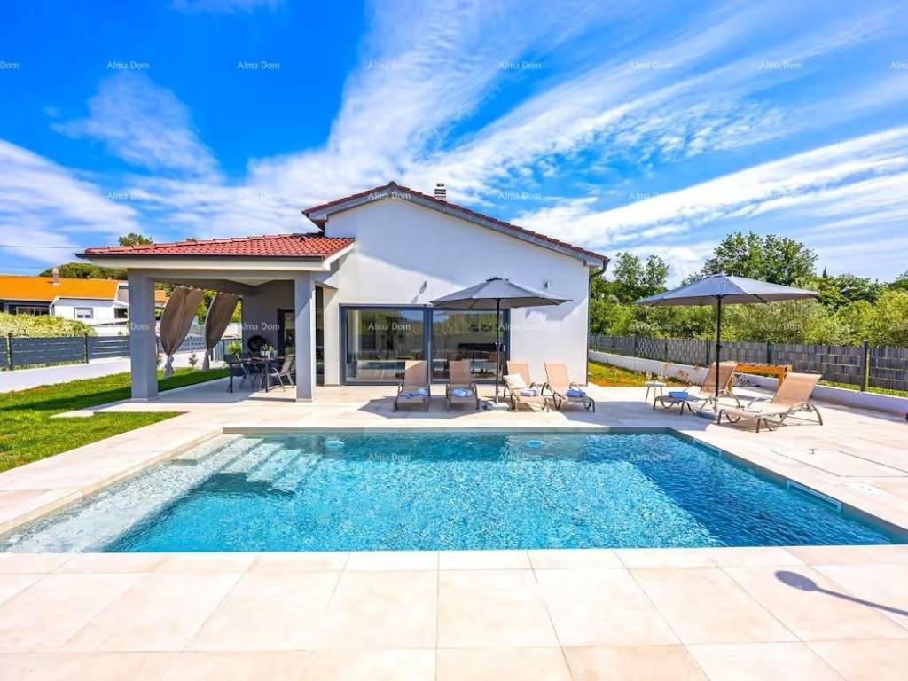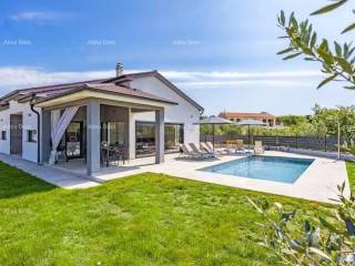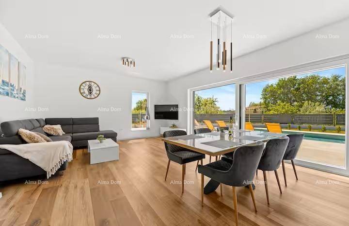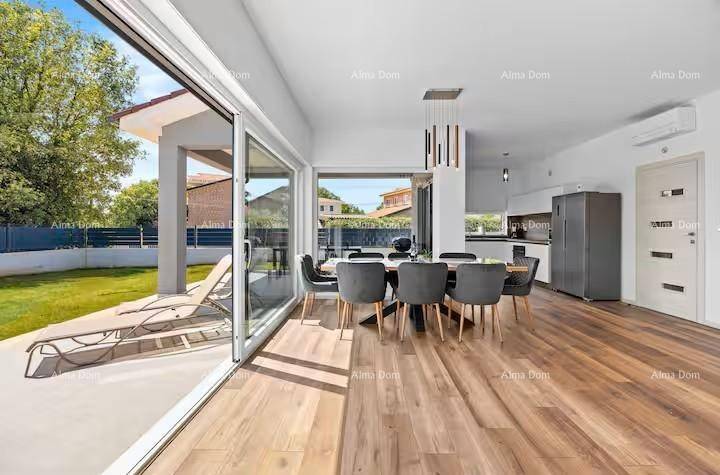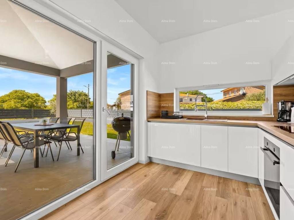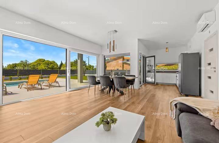Close to Medulin! We offer a detached house consisting of a spacious hallway, a bathroom, a guest toilet, three bedrooms, and another bathroom, as well as a large living room with a kitchen and dining area. Large glass walls extend the entire length of the living room and kitchen. There is a large terrace in front of the house. The house is fully furnished and ready for immediate occupancy. Underfloor heating and air conditioning in every room. Parking available for two vehicles. Luxury single-story home!
