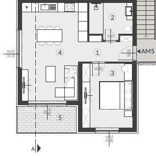 Apartment AM5- is located on the 1st floor of the building and consists of: hallway + wardrobe, bathroom, bedroom, living room with kitchen and dining room and balcony.