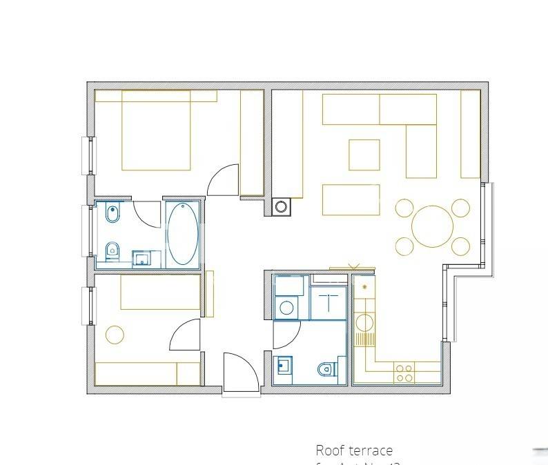 The apartment has a net usable area of 92 m and consists of an entrance hall, open-plan living room with kitchen, two bedrooms, two bathrooms, and a covered terrace. Additionally, it includes a 26 m enclosed private garden, a basement storage room, and two garage parking spaces.