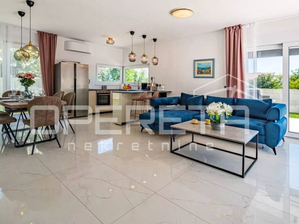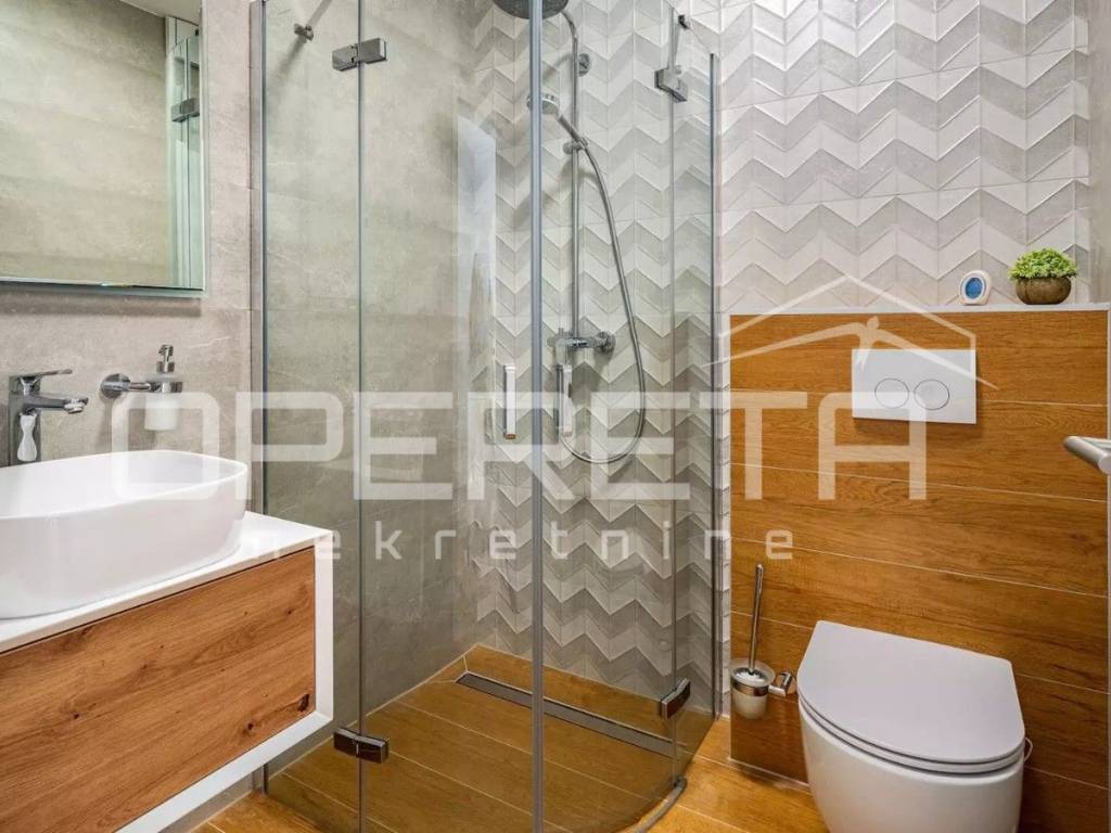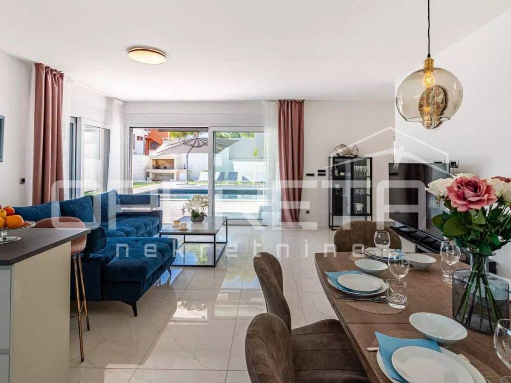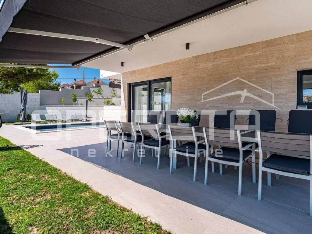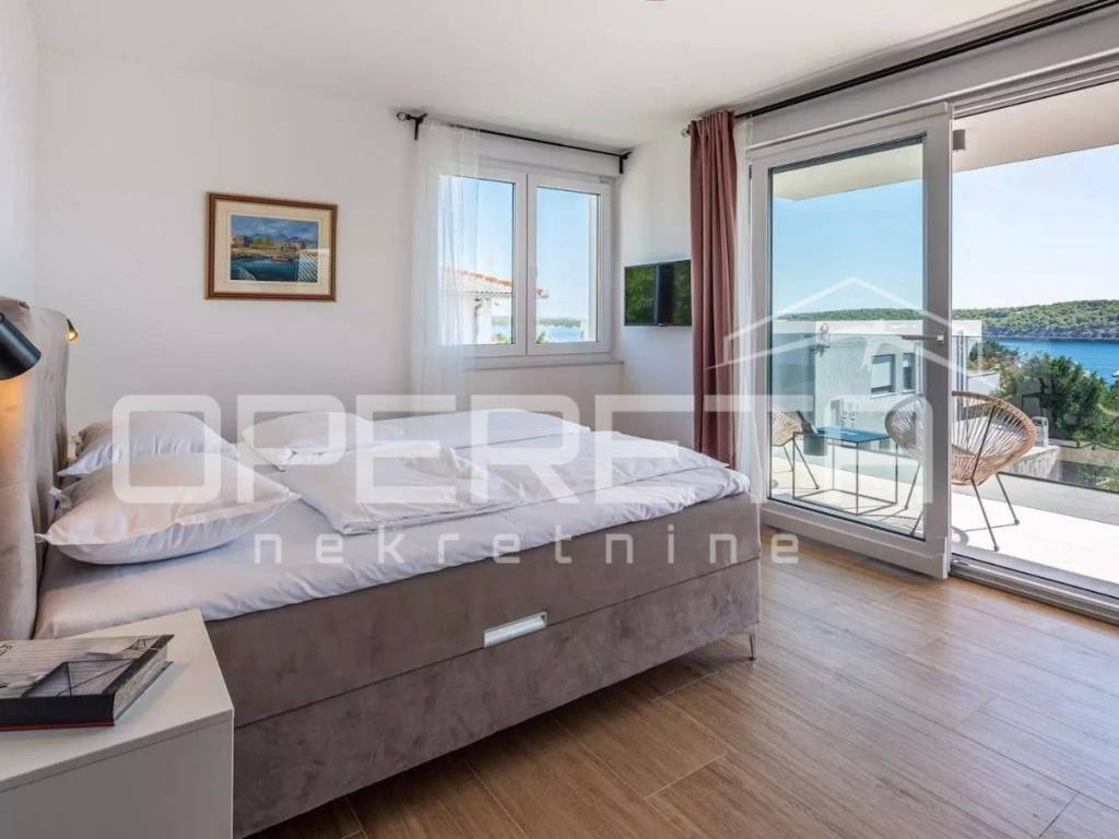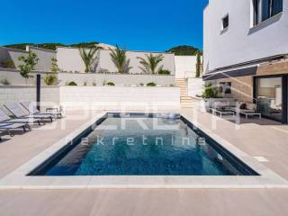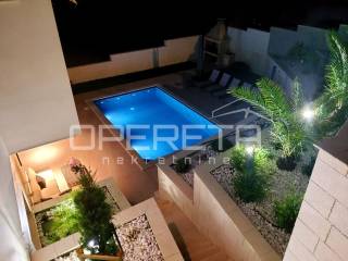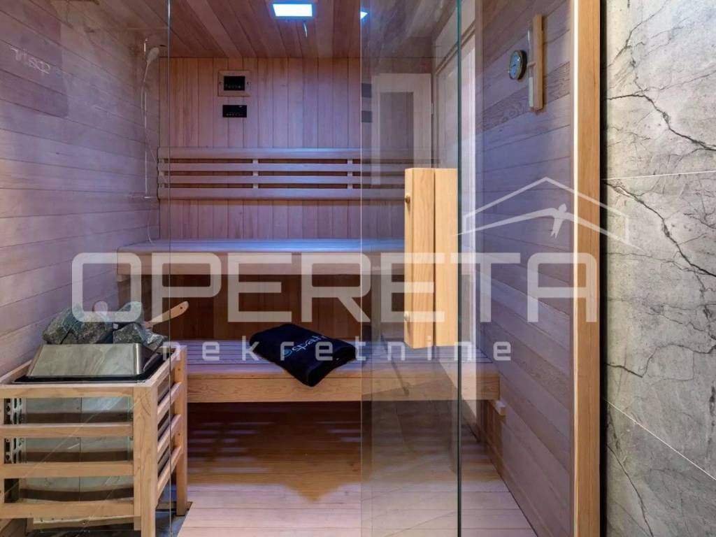 Rab, Barbat na Rabu, semi-detached villa with swimming pool for sale A unique luxury semi-detached villa with a swimming pool is for sale in the immediate vicinity of the sea and the main road. The villa consists of two buildings, an apartment on the top floor with a beautiful sea view. The apartment consists of 2 bedrooms, a bathroom and a kitchen connected to the dining room and kitchen. The apartment has a covered terrace with a jacuzzi. It also consists of a second, two-story apartment, which has a total of 4 bedrooms with private bathrooms, a kitchen connected to the dining room and living room from which you can exit to the courtyard area where there is a beautiful 28m2 swimming pool, a large barbecue and a sheltered area for socializing. On the ground floor, the villa has a leisure area - a sauna and fitness room and a game room. The villa has its own parking for 5 vehicles and separate entrances to each building.
