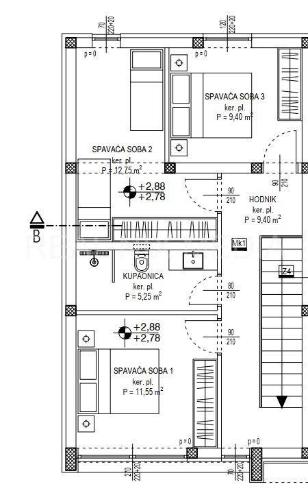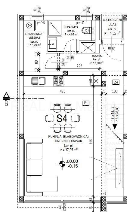 S4 - u prizemlju se nalazi natkriveni ulaz, hodnik, kupaonica, vešeraj, kuhinja, blagovaonica i dnevni boravak sa izlazom na VRT (95,00 m2). Na katu kuće smještene su tri spavaće sobe i kupaonica. U dvorištu kuće nalaze se dva vanjska parkirna mjesta. Cijena: 380.568,00 EUR-a.
