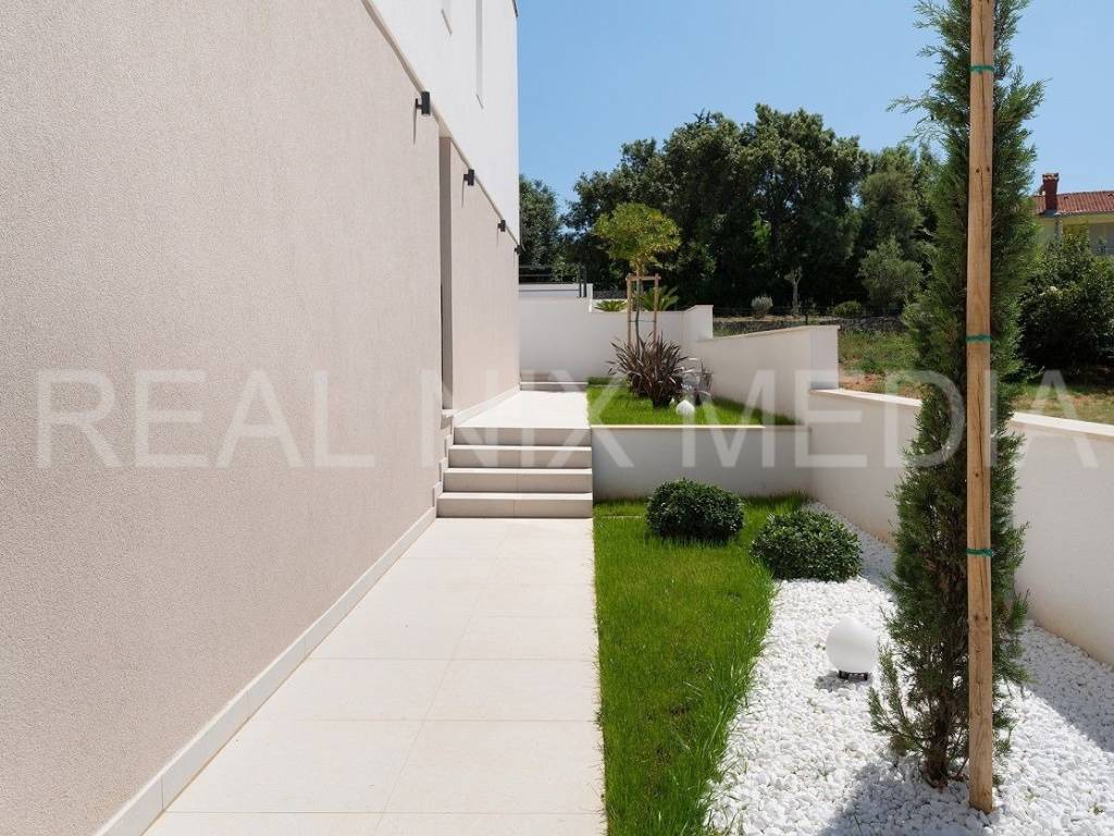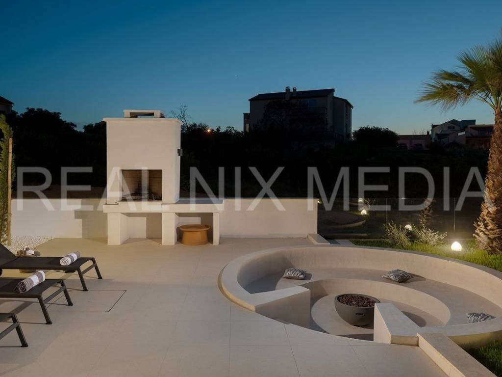 Vilu okružuje predivno uređeno dvorište u kojem se nalazi grijani bazen veličine 38 m2 , uređen prostor za sunčanje, natkrivene i nenatkrivene terase, prostor za druženje i zabavu.