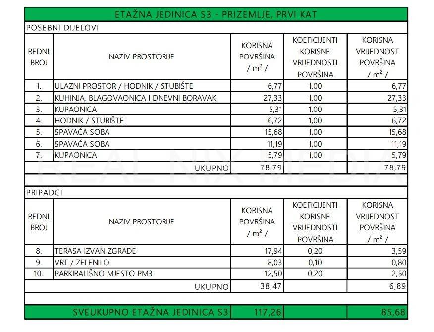 STAN OZNAKE S3 ukupno netto korisne površine 85,68 m2 je dvoetažni stan koji se nalazi u prizemlju i na prvom katu. U prizemlju se nalaze kuhinja, blagovaonica, dnevni boravak, hodnik, kupaonica i prostrana loggia. Na prvom katu su hodnik, kupaonica i dvije spavaće sobe.