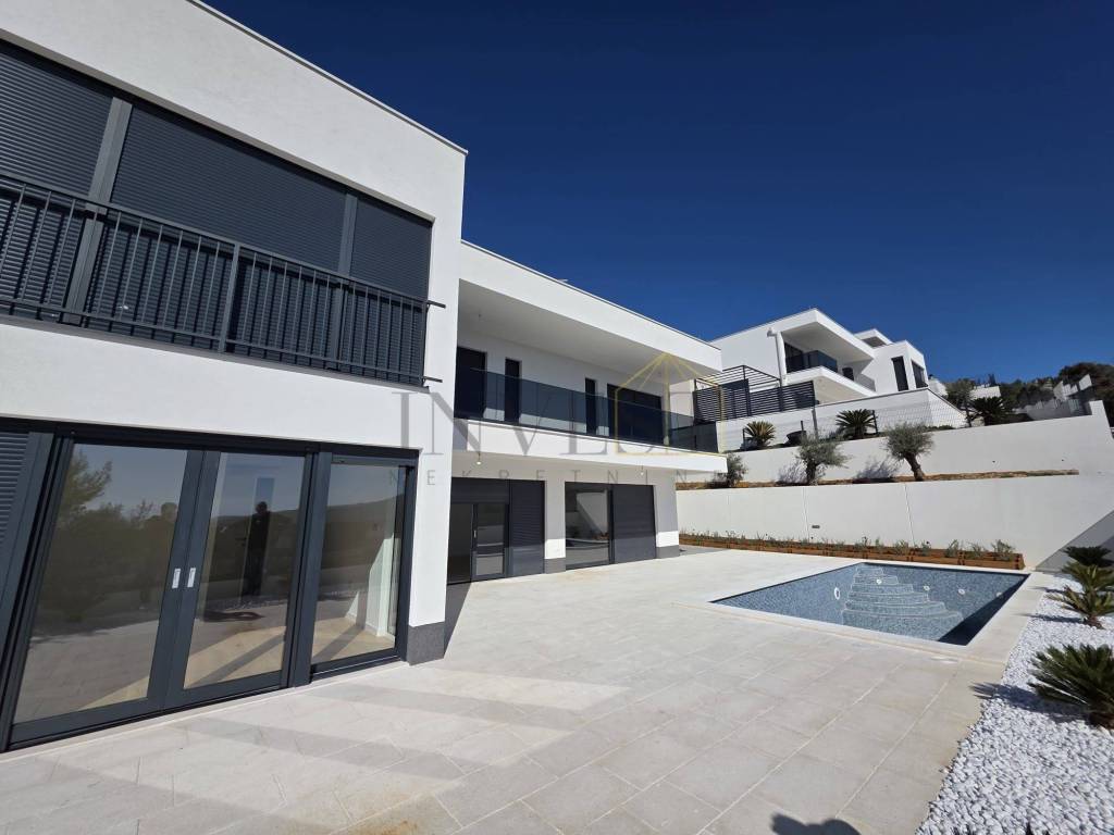 A modern, newly built villa from 2025 is for sale, located in a quiet location in Vinišće with an open panoramic view of the sea. The villa has a living area of 200 m and is located on a plot of 540 m. It consists of four spacious bedrooms and five fully equipped bathrooms. All bathrooms, as well as the kitchen and living room, have underfloor heating, while all rooms are air-conditioned with Mitsubishi air conditioners. The property is under video surveillance, and in the yard there is a swimming pool measuring 8 x 3.7 meters, with preparation for an outdoor shower and an outdoor kitchen. The 100 m natural stone terrace is ideal for relaxing and socializing, and an additional storage room in the yard provides additional functionality. The house is built with high-quality thermal insulation (10 cm of polystyrene), which ensures energy efficiency and comfort throughout the year. This property is an ideal choice for family life, a luxury vacation or as an investment in a tourist rental.