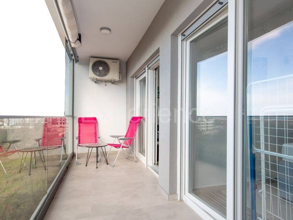 A modern apartment for sale in a newly built residential building, located on the 3rd floor with an elevator, offering a beautiful sea view. The apartment has a functional layout and consists of an open-plan living room with kitchen and dining area, one bedroom, bathroom, and a loggia.