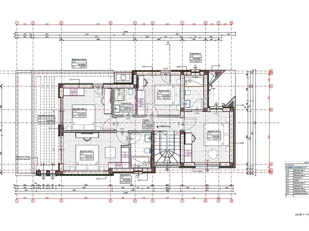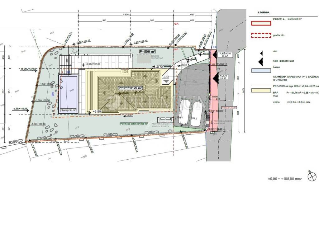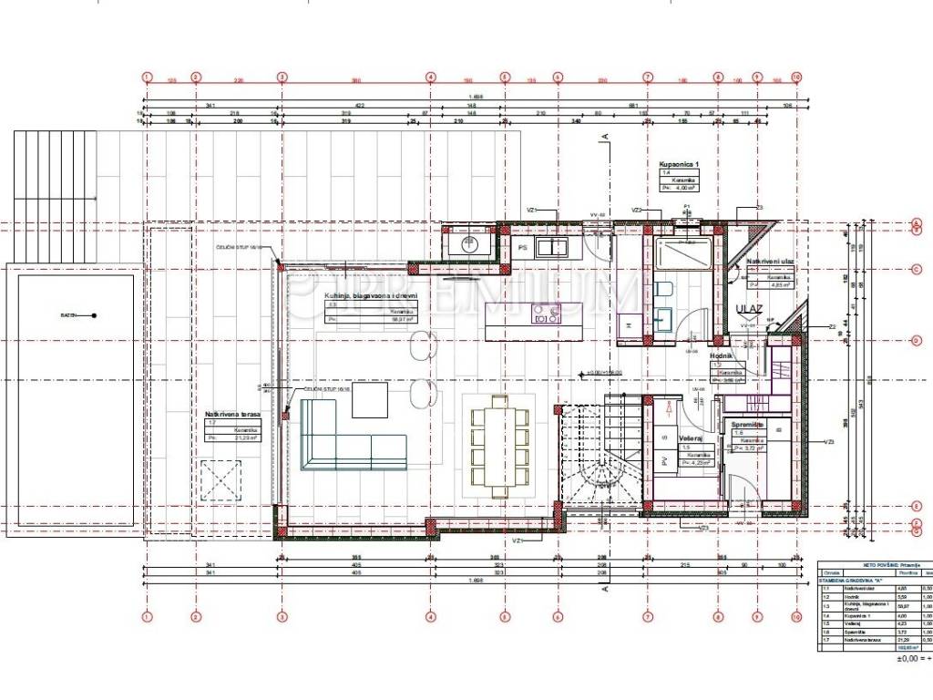 On a 500 m² plot, the construction of an attractive villa with a swimming pool is planned. The villa, with a net living area of 160 m², consists of a ground floor and an upper floor. The ground floor (89.57 m²) includes an entrance hall, laundry room, storage room, bathroom, kitchen, dining area, and living room with access to a covered terrace (21.29 m² x 0.5 = 10.64 m²). The upper floor features 4 bedrooms and 3 bathrooms. Two bedrooms have access to a shared terrace with sea view.