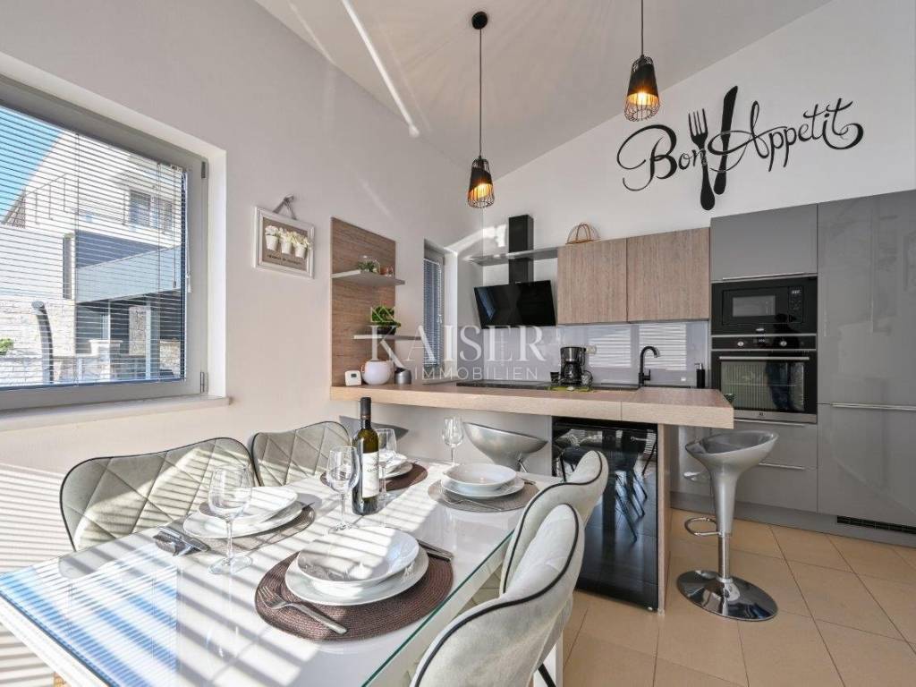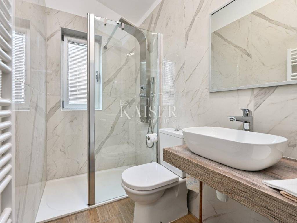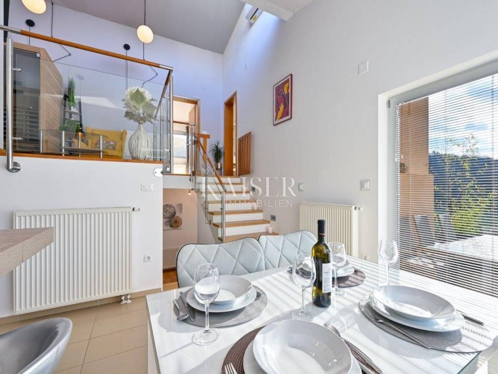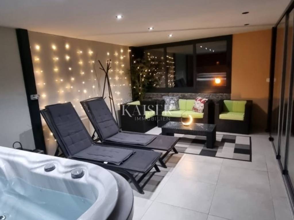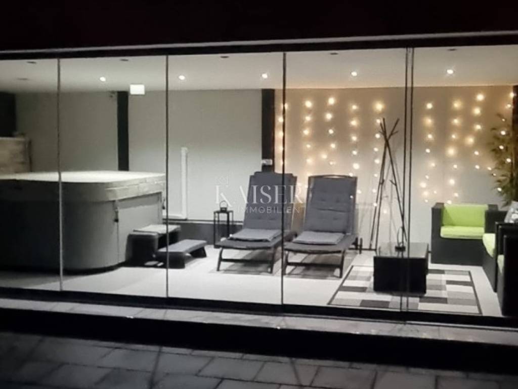 Kaiser-Immobilien mediates in the sale of a luxury villa with a living area of 125 m² with 369 m² of superbly landscaped garden, outdoor pool, winter terrace and 3 parking spaces. On the ground floor there is an entrance area, a living room with a dining room and a bathroom. On the mezzanine floor there is a modern kitchen with a dining room, from which there is access to an outdoor terrace, a winter terrace with a hydromassage pool and an outdoor heated pool of 32 m² with electrolysis. On the upper floor there is a smaller living room with a sauna, two bathrooms and two bedrooms, one of which has access to a beautiful sunny balcony.