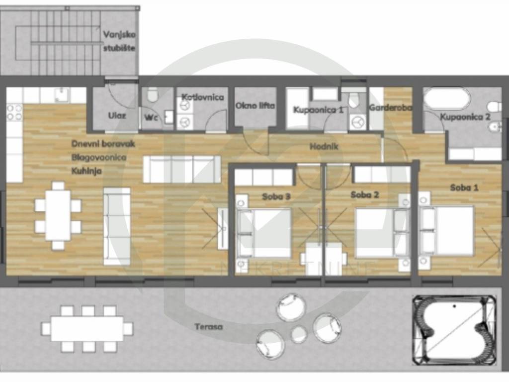 Stan se sastoji od ulaznog prostora, kuhinje + blagovaonice i dnevnog boravaka, WC-a, vešeraja, hodnika, 2 kupaone, spavaće sobe sa garderobom + 2 spavaće sobe.