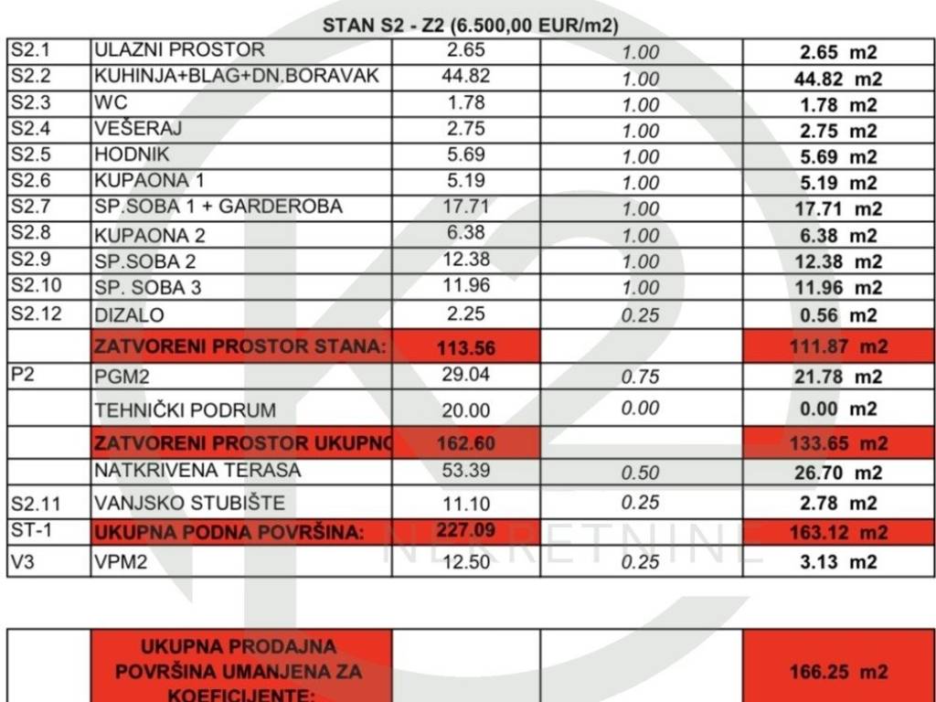 Stan je ukupne neto površine 166,25 m, korisne površine 239,59 m2.
