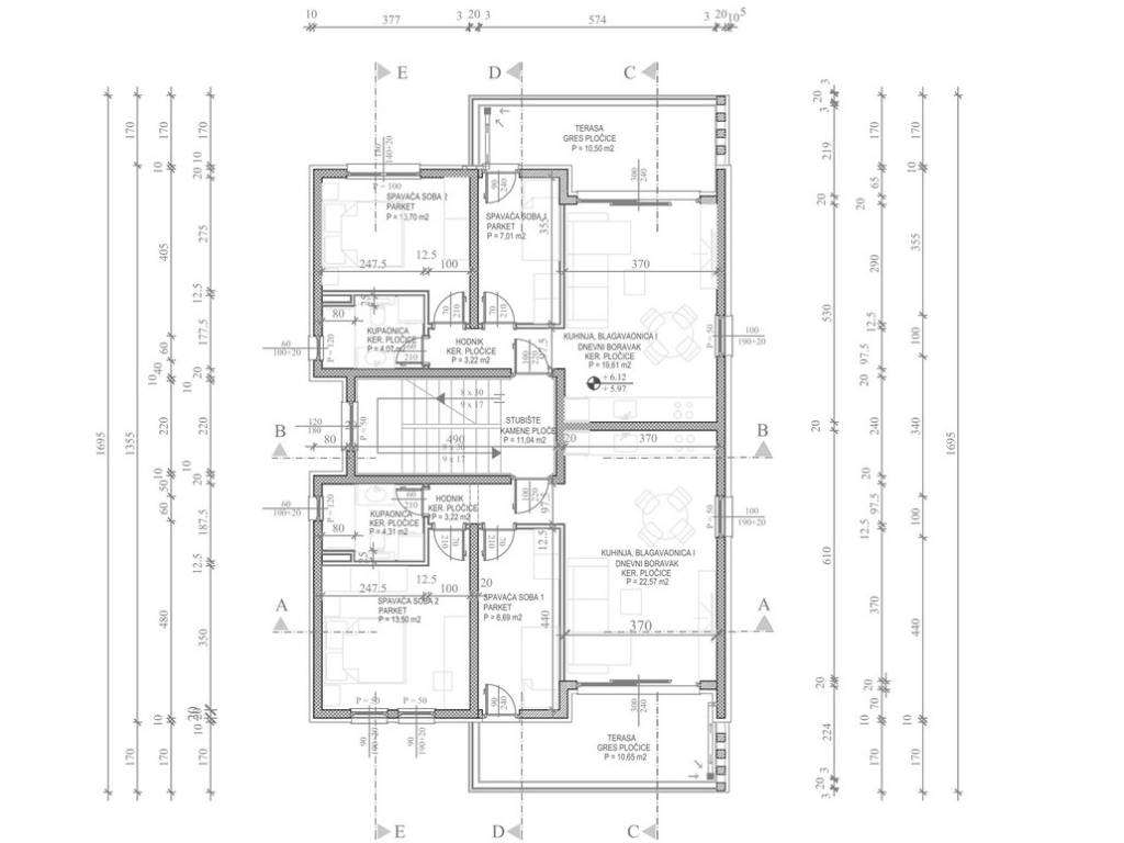 Sastoji se od: dvije spavaće sobe, dnenog boravka + kuhinja + blagovaona, hodnika, kupaonice i terase.
