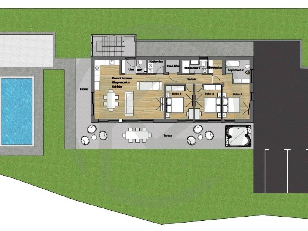 Stanu pripada dizalo, garažno parkirno mjesto i 2 vanjska parkirna mjesta, tehnički podrum, vanjsko stubište, natkrivena terasa, nenatkrivena terasa oko bazena, bazen i dvorište sa zelenilom 300 m2.