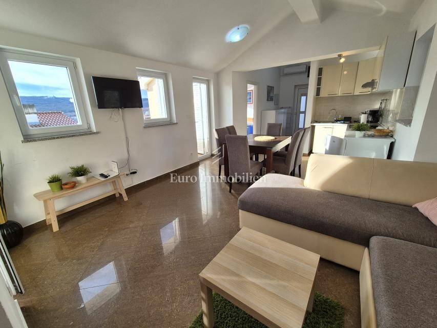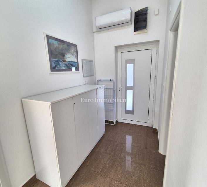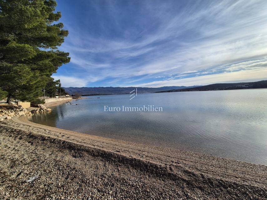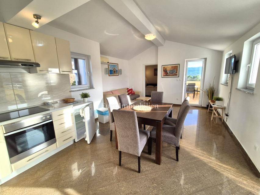 Soline Bay, island of Krk, apartment for sale measuring 55 m2, in an excellent location just 50 m from the beach. The apartment is located on the second floor of a residential building and consists of an entrance hall, living room with kitchen and dining area, bathroom, two bedrooms, one of which has access to a terrace and a balcony with an open sea view. The apartment boasts an excellent layout, and is sold fully furnished and ready to use. One parking space is provided in the common part of the yard. All amenities are within walking distance of the apartment.