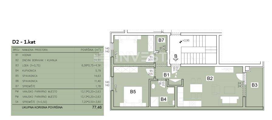 Apartment D2 is on the first floor and is functionally designed to maximize comfort and space efficiency. The total area is 77.46 m², with the living area covering 68.60 m². It consists of an entrance hall, spacious living room with kitchen and dining area in an open-plan concept, two bedrooms, bathroom, storage room, and a loggia providing extra relaxation space. The ground floor includes a spacious storage room, and the apartment comes with two outdoor parking spaces around the building.