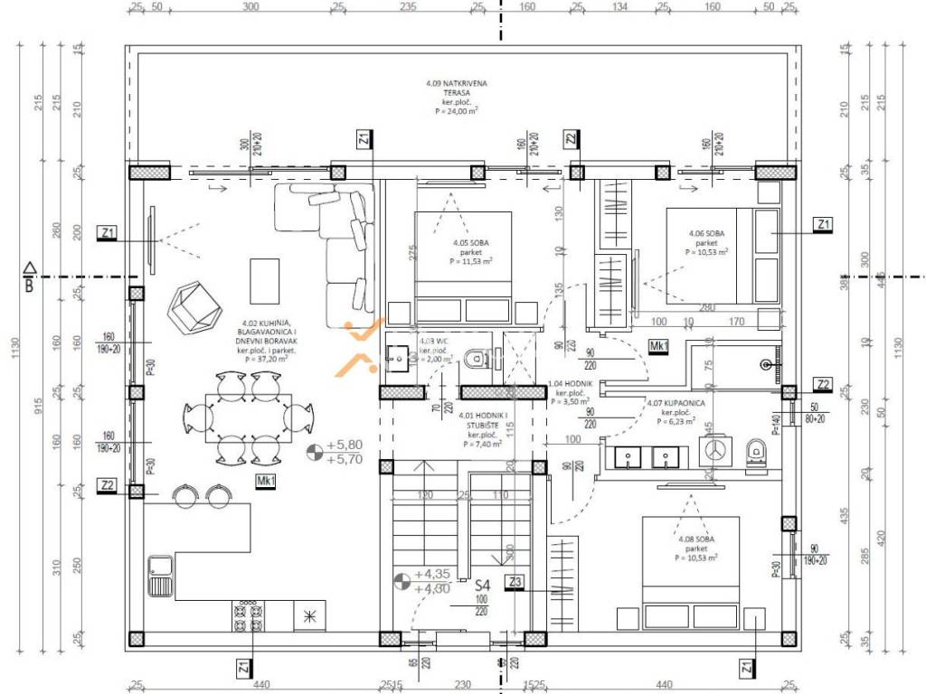 The apartment is situated on the second floor and features a functional layout consisting of an entrance hall, three bedrooms, a bathroom, a separate toilet, a kitchen with dining area and living room in an open space concept, and a covered terrace. The net usable area of the described rooms is 100,92 m2, while the total net area with accessories is 105,92 m2. The property includes two parking spaces, which further increase its value and practicality.