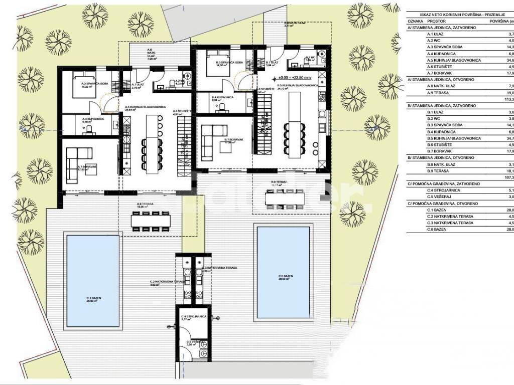 Na zemljištu su plaćeni komunalni doprinosi, a dostupna je važeća građevinska dozvola i moderni arhitektonski projekt. Projektom je predviđena gradnja dvojne kuće ukupne površine 180 m, raspoređene na dvije etaže, s bazenom.