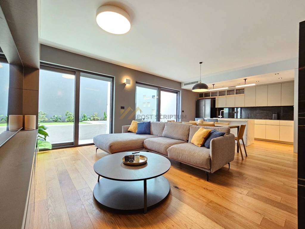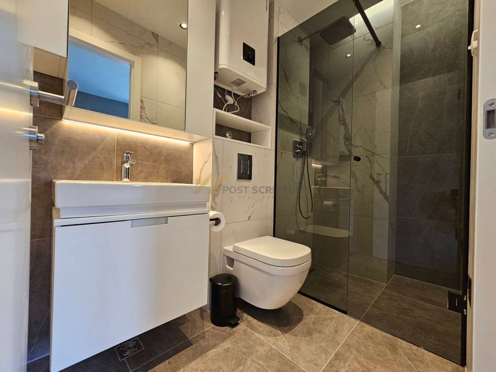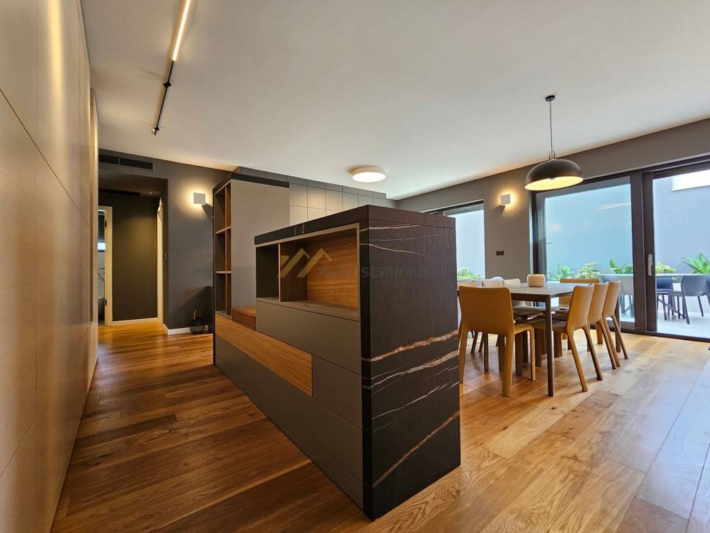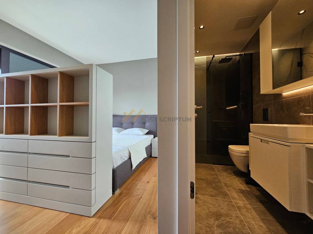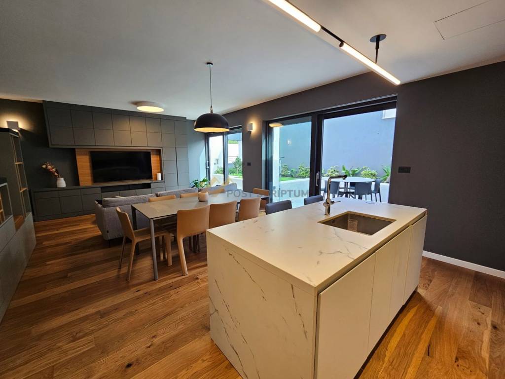 The apartment consists of entrance area with small toilet, kitchen with dining room and spacious living room with access to beautiful terrace, bedroom with its own bathroom and access to the same terrace, two more bedrooms, each with its own bathroom, one of which has a south-facing room with separate loggia overlooking the sea.