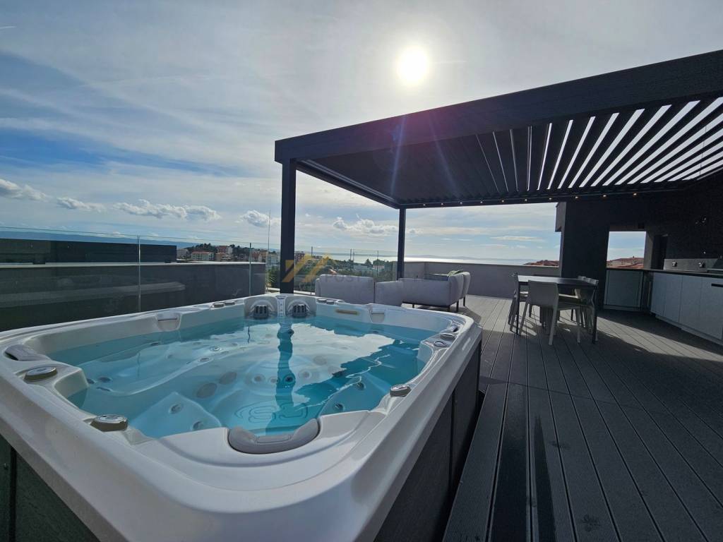 On the upper floor of the apartment there is spacious terrace with an equipped kitchen, gas grill, jacuzzi, shower, sunbed and furniture for rest and enjoyment!