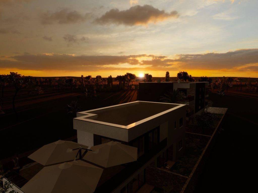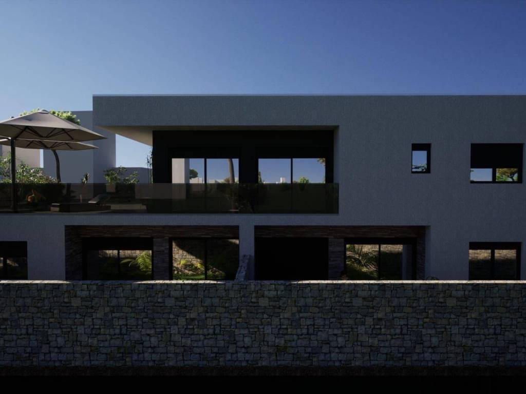 This modern apartment consists of an open living area combining the kitchen and dining room, two bedrooms, one bathroom, a separate toilet, a hallway, and a spacious partially covered terrace with a sea view.