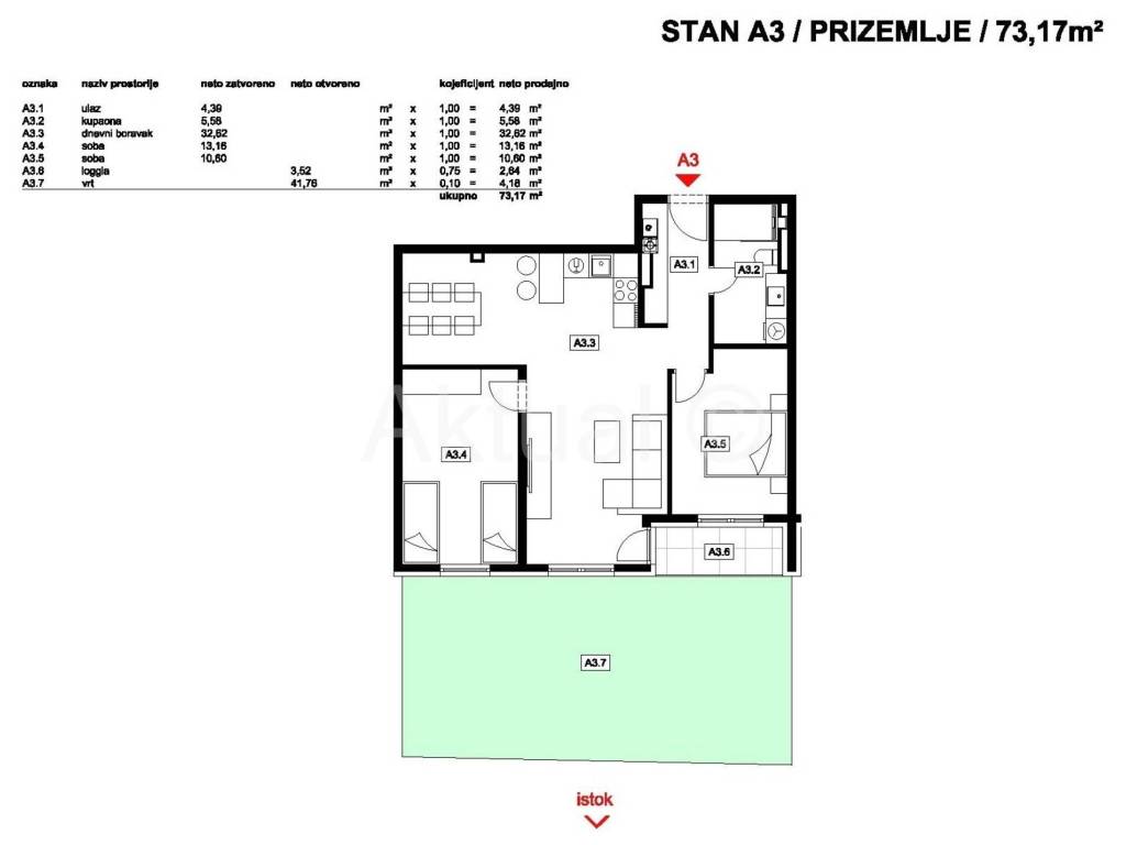 Stan oznake A3 nalazi se u prizemlju zgrade, ukupne površine 73.17 m2 a sastoji se od ulaznog prostora/hodnika, kuhinje, blagovaonice i dnevnog boravka, dvije sobe, kupaonice, loggie i vrta.