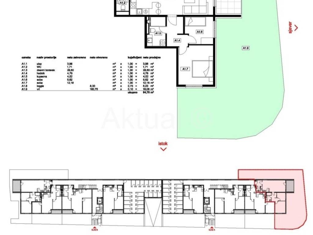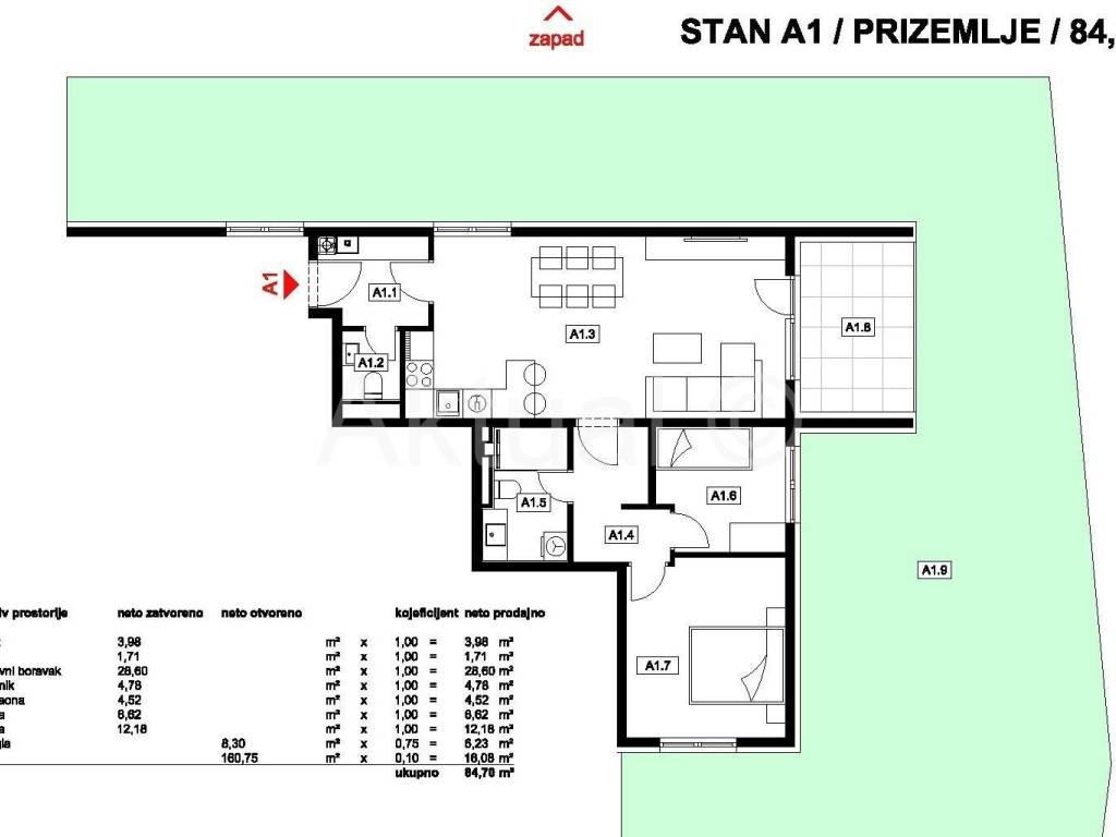 Stan oznakeA1 nalazi se u prizemlju zgrade, ukupne površine 84.70 m2 a sastoji se od ulaznog prostora/hodnika, kuhinje, blagovaonice i dnevnog boravka, dvije sobe, kupaonice, wc-a, loggie i vrta.